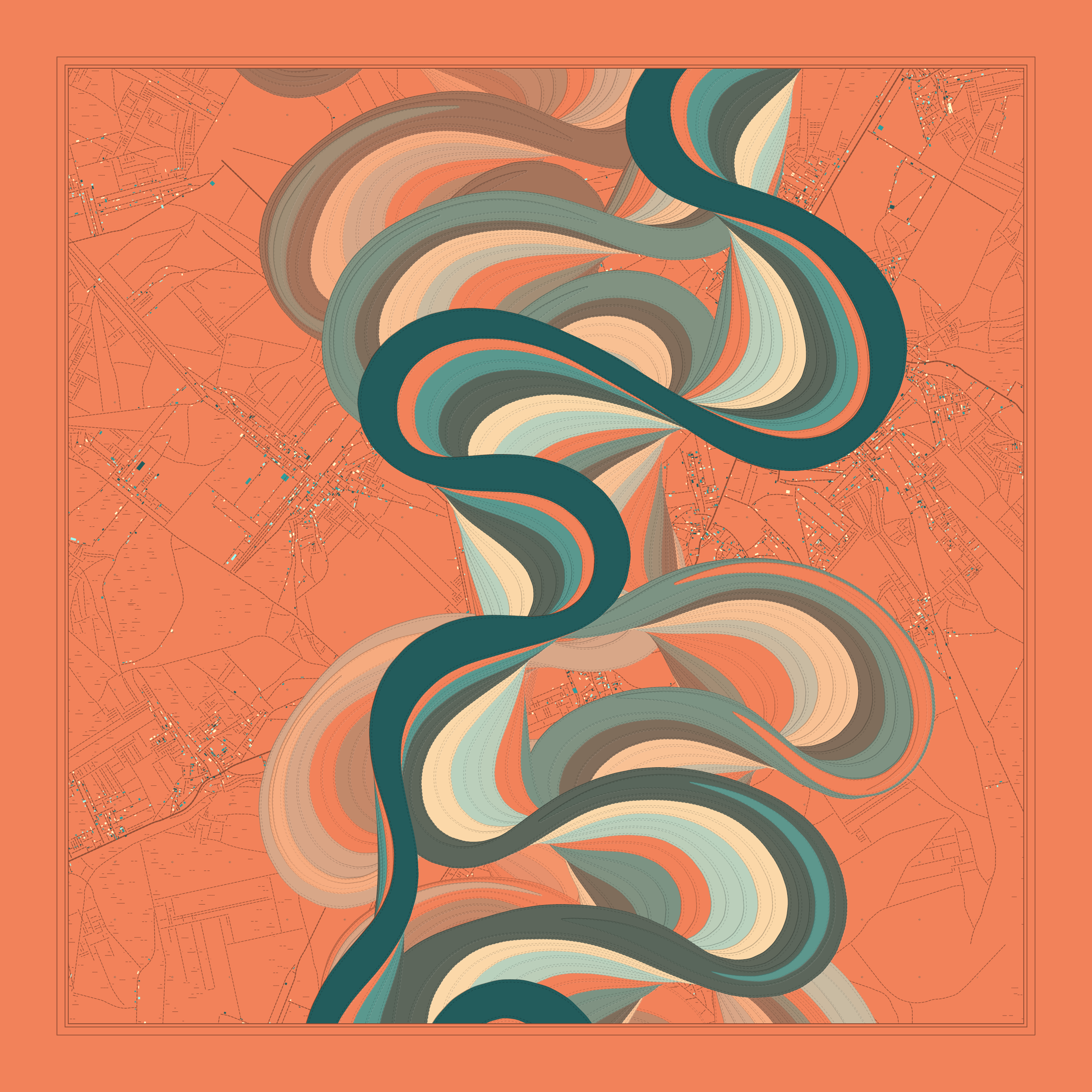 Ancient Courses is a generative experience that explores the aesthetics of meandering rivers and the settlements that form on their banks. The design is graphic and cartographic with bold color palettes rendered against map iconography and line sensibility. From the river banks, roads stretch across the landscape: sometimes a single access road, other times sprawling towns. The river meandering is simulated via a custom algorithm which closely models the real world process.