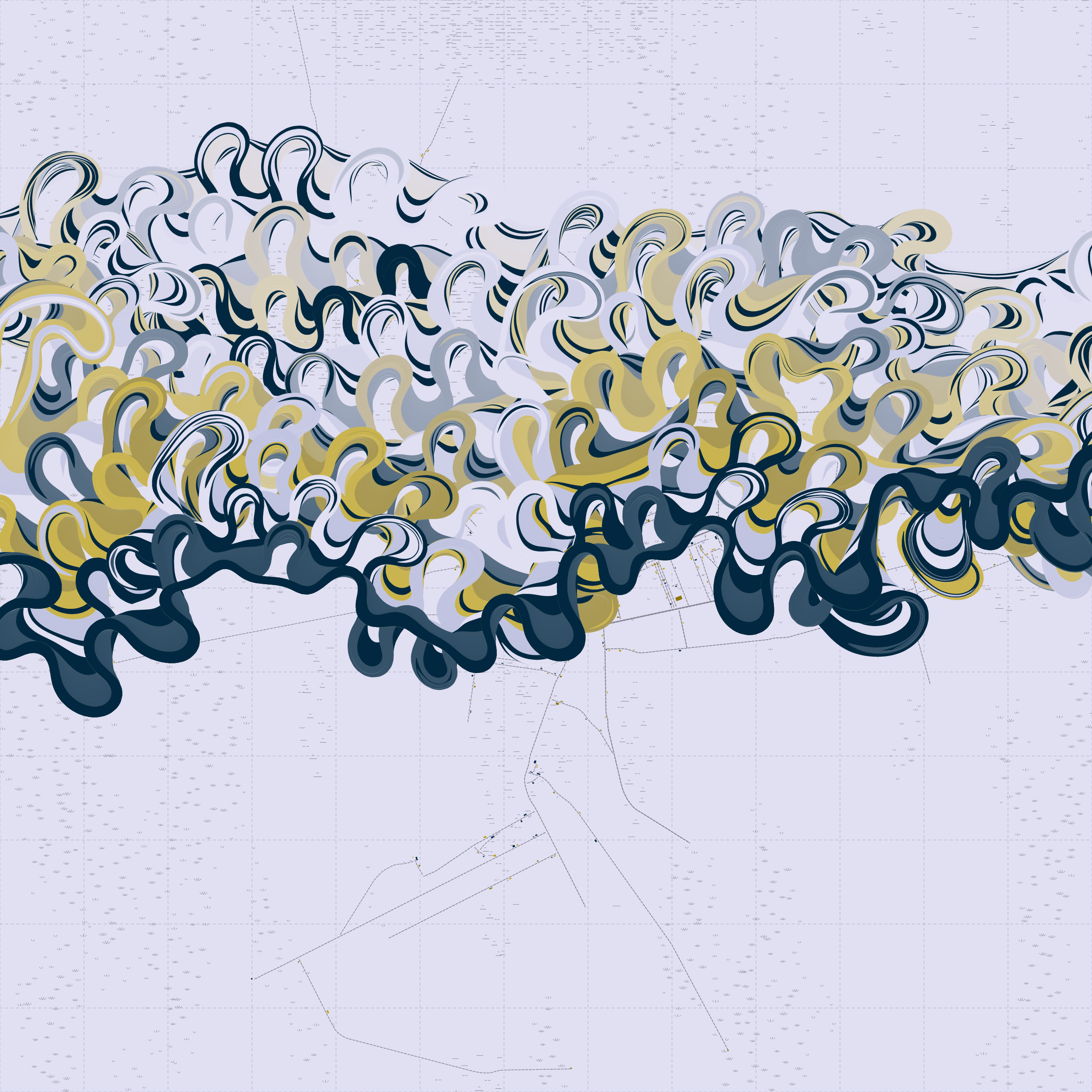 Ancient Courses is a generative experience that explores the aesthetics of meandering rivers and the settlements that form on their banks. The design is graphic and cartographic with bold color palettes rendered against map iconography and line sensibility. From the river banks, roads stretch across the landscape: sometimes a single access road, other times sprawling towns. The river meandering is simulated via a custom algorithm which closely models the real world process.
