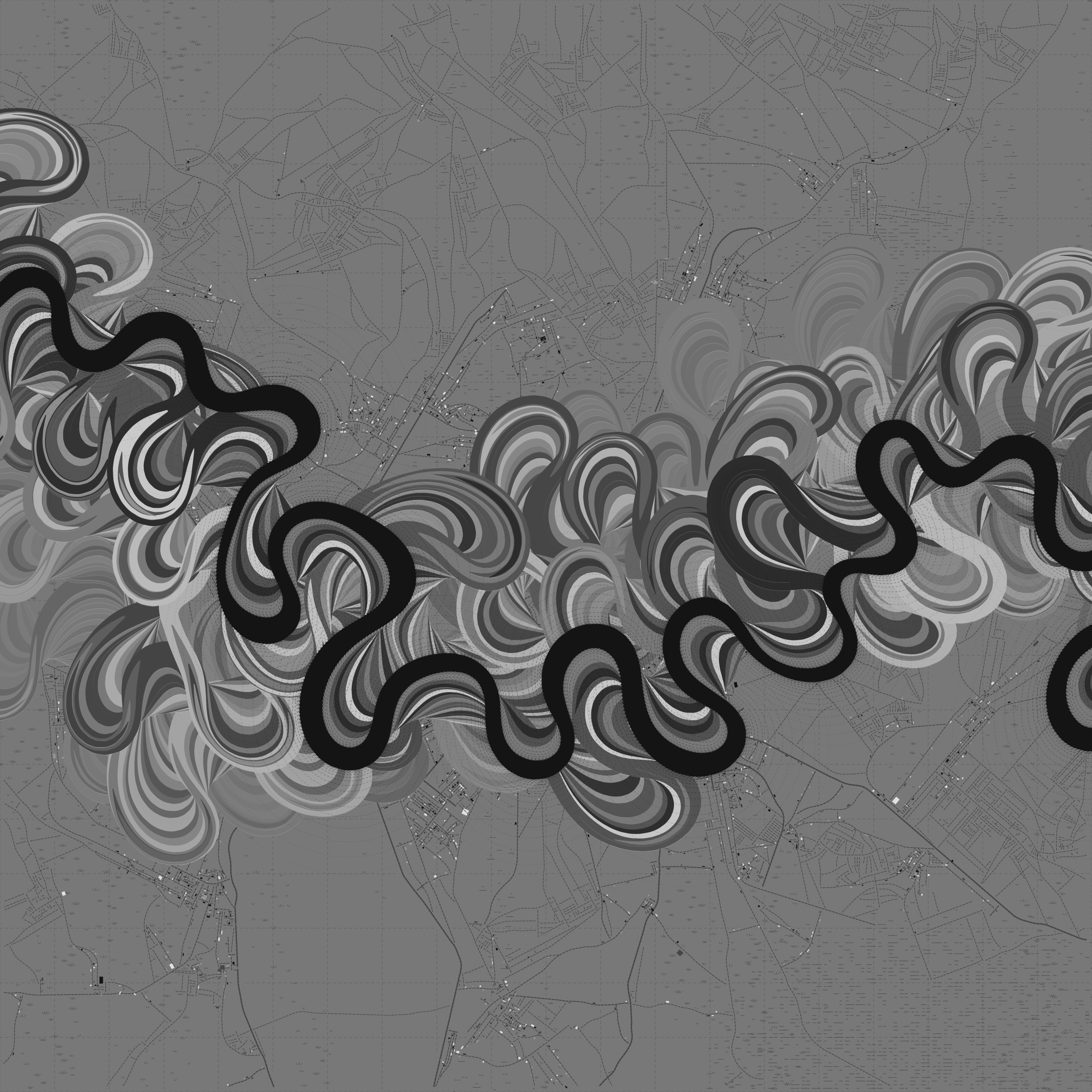 Ancient Courses is a generative experience that explores the aesthetics of meandering rivers and the settlements that form on their banks. The design is graphic and cartographic with bold color palettes rendered against map iconography and line sensibility. From the river banks, roads stretch across the landscape: sometimes a single access road, other times sprawling towns. The river meandering is simulated via a custom algorithm which closely models the real world process.