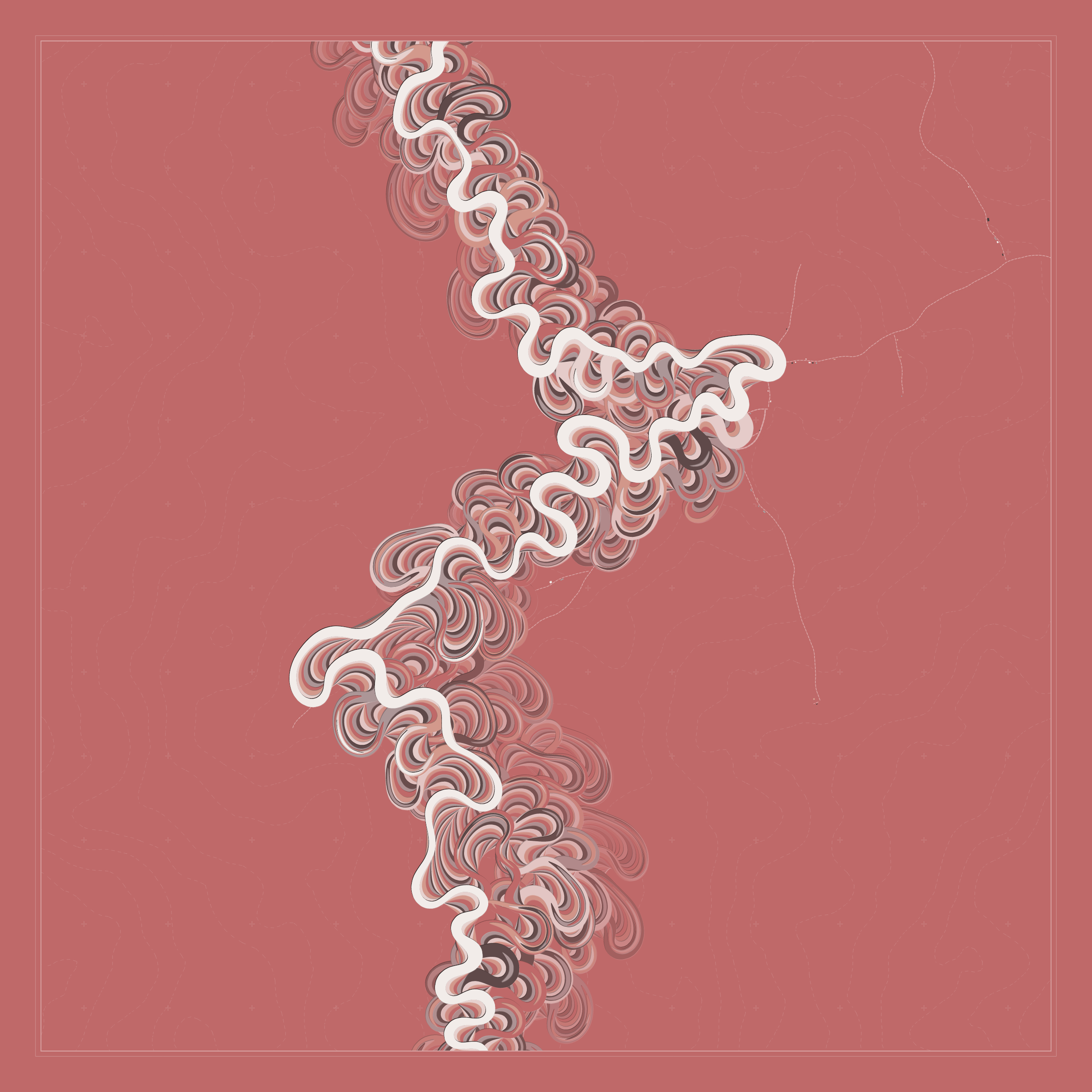 Ancient Courses is a generative experience that explores the aesthetics of meandering rivers and the settlements that form on their banks. The design is graphic and cartographic with bold color palettes rendered against map iconography and line sensibility. From the river banks, roads stretch across the landscape: sometimes a single access road, other times sprawling towns. The river meandering is simulated via a custom algorithm which closely models the real world process.