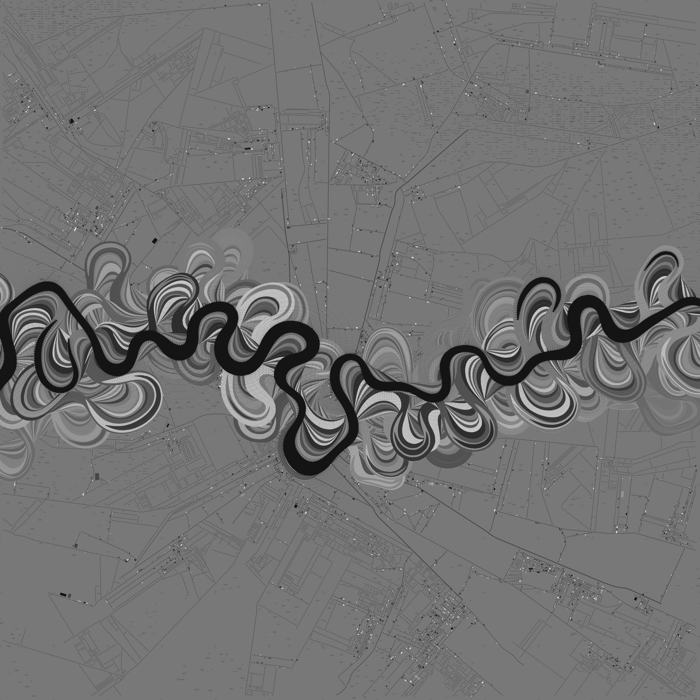 Ancient Courses is a generative experience that explores the aesthetics of meandering rivers and the settlements that form on their banks. The design is graphic and cartographic with bold color palettes rendered against map iconography and line sensibility. From the river banks, roads stretch across the landscape: sometimes a single access road, other times sprawling towns. The river meandering is simulated via a custom algorithm which closely models the real world process.