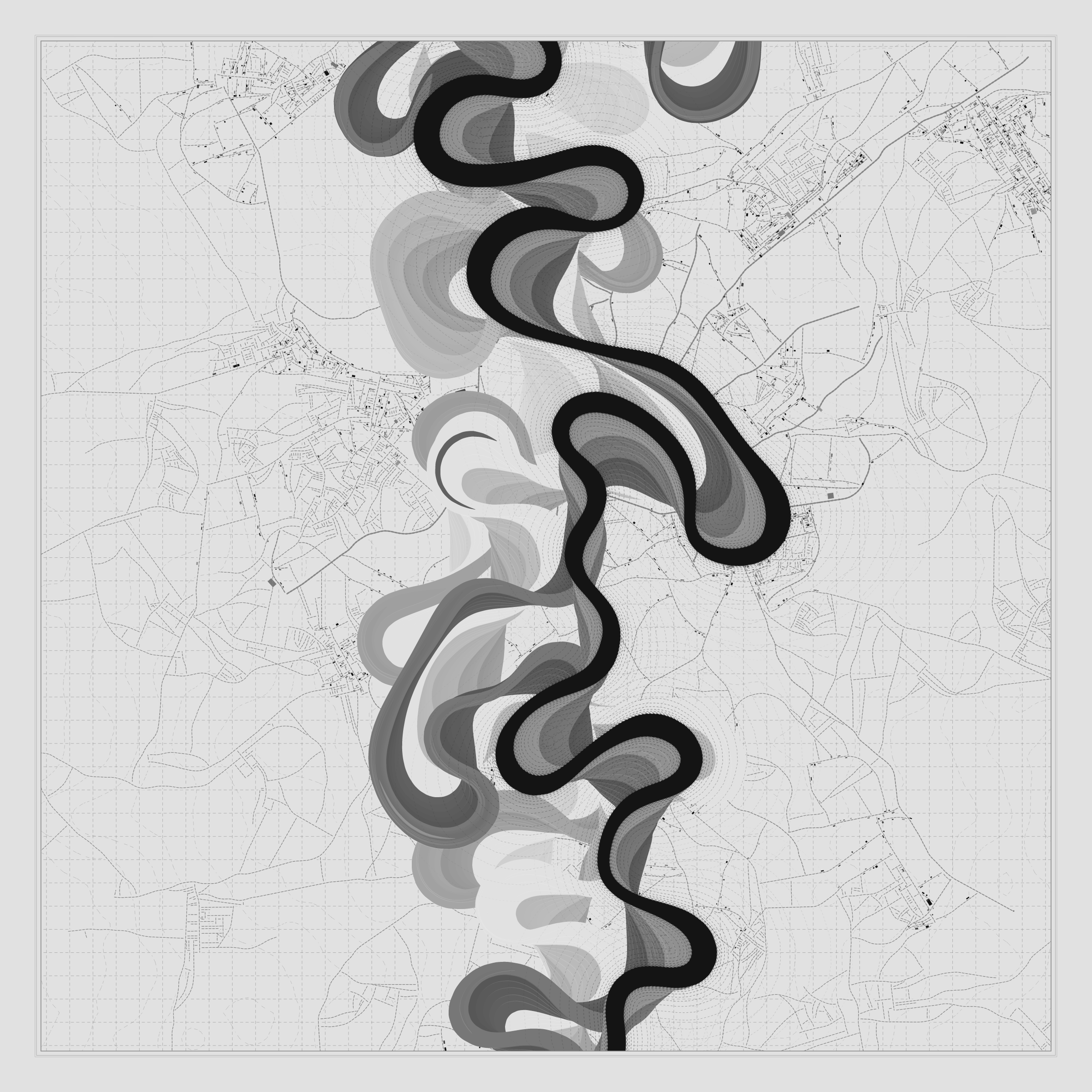 Ancient Courses is a generative experience that explores the aesthetics of meandering rivers and the settlements that form on their banks. The design is graphic and cartographic with bold color palettes rendered against map iconography and line sensibility. From the river banks, roads stretch across the landscape: sometimes a single access road, other times sprawling towns. The river meandering is simulated via a custom algorithm which closely models the real world process.