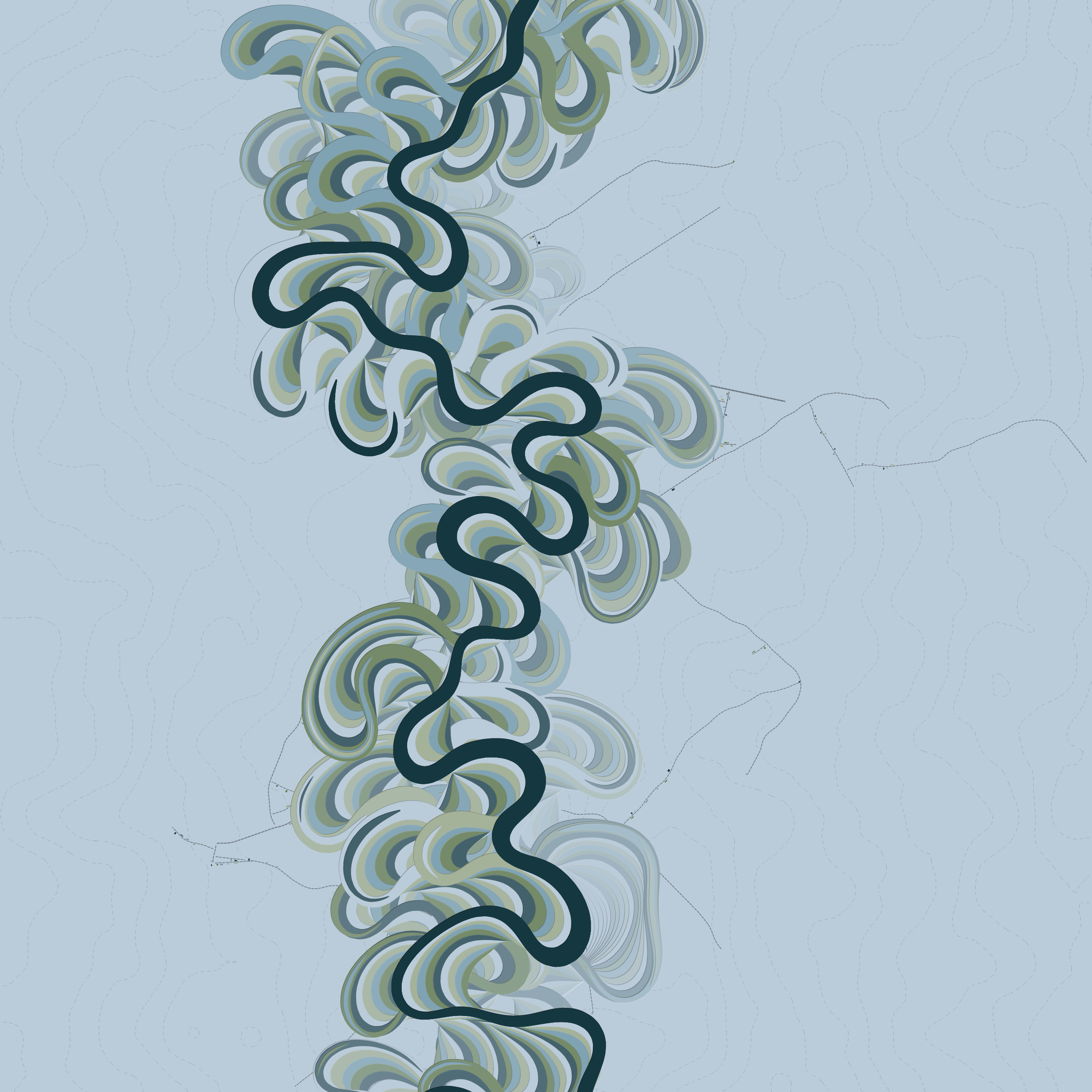 Ancient Courses is a generative experience that explores the aesthetics of meandering rivers and the settlements that form on their banks. The design is graphic and cartographic with bold color palettes rendered against map iconography and line sensibility. From the river banks, roads stretch across the landscape: sometimes a single access road, other times sprawling towns. The river meandering is simulated via a custom algorithm which closely models the real world process.