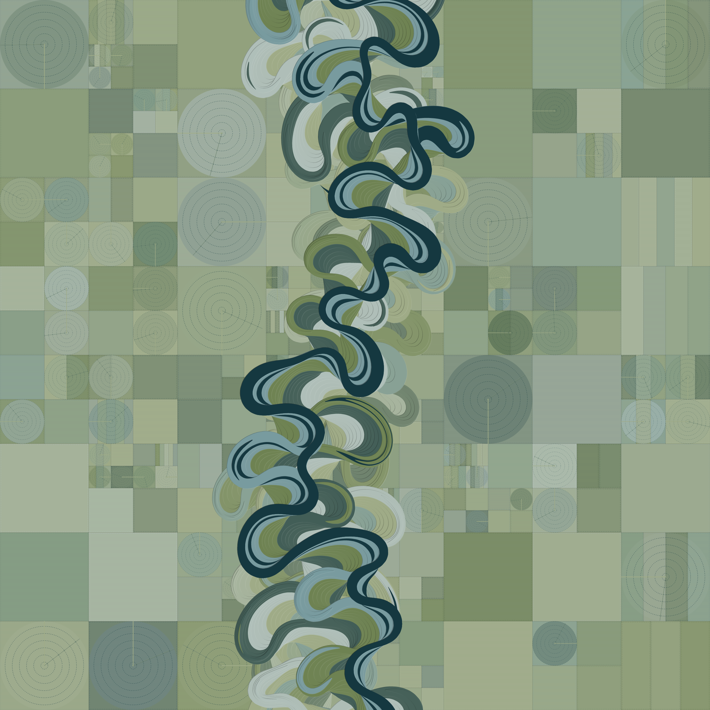 Ancient Courses is a generative experience that explores the aesthetics of meandering rivers and the settlements that form on their banks. The design is graphic and cartographic with bold color palettes rendered against map iconography and line sensibility. From the river banks, roads stretch across the landscape: sometimes a single access road, other times sprawling towns. The river meandering is simulated via a custom algorithm which closely models the real world process.