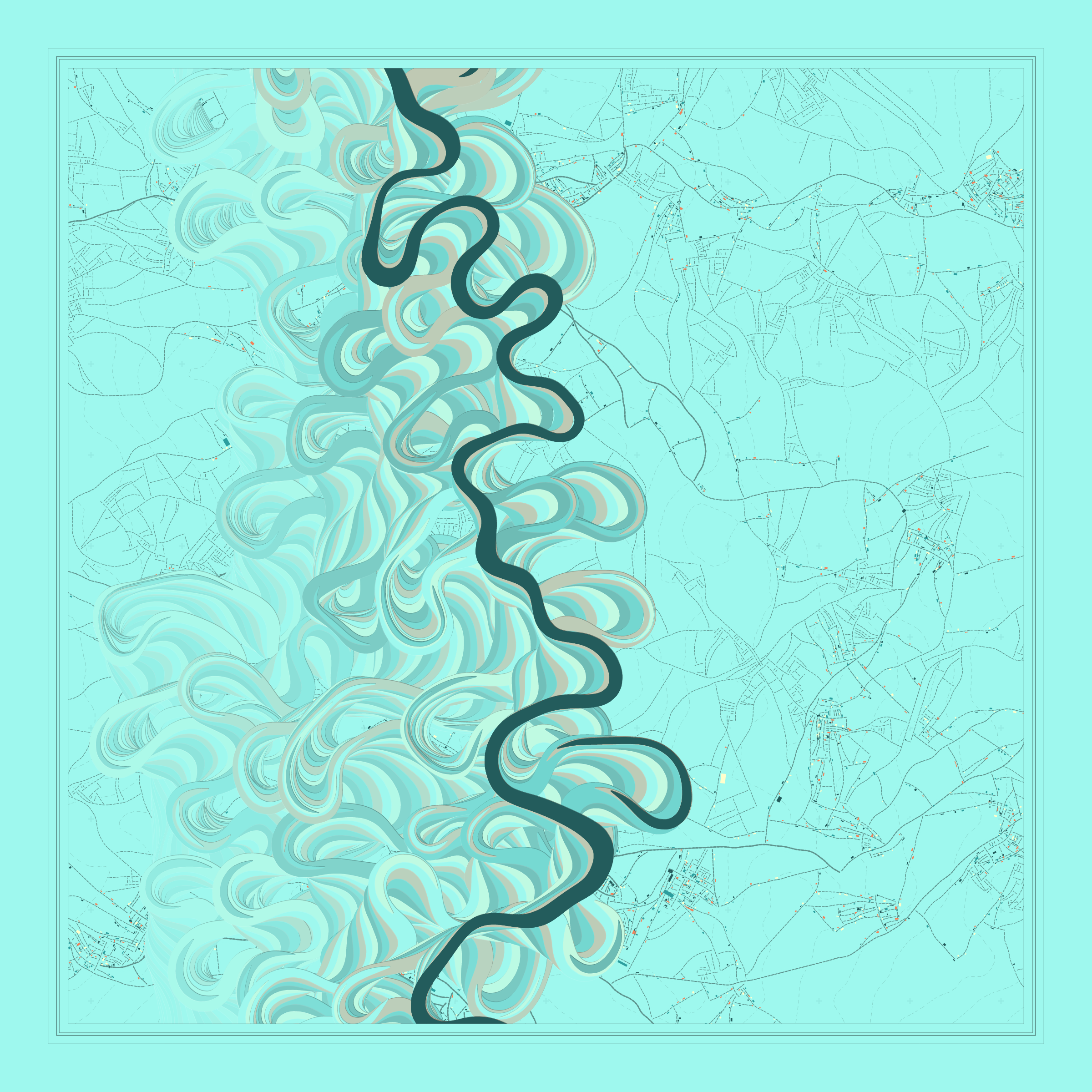 Ancient Courses is a generative experience that explores the aesthetics of meandering rivers and the settlements that form on their banks. The design is graphic and cartographic with bold color palettes rendered against map iconography and line sensibility. From the river banks, roads stretch across the landscape: sometimes a single access road, other times sprawling towns. The river meandering is simulated via a custom algorithm which closely models the real world process.