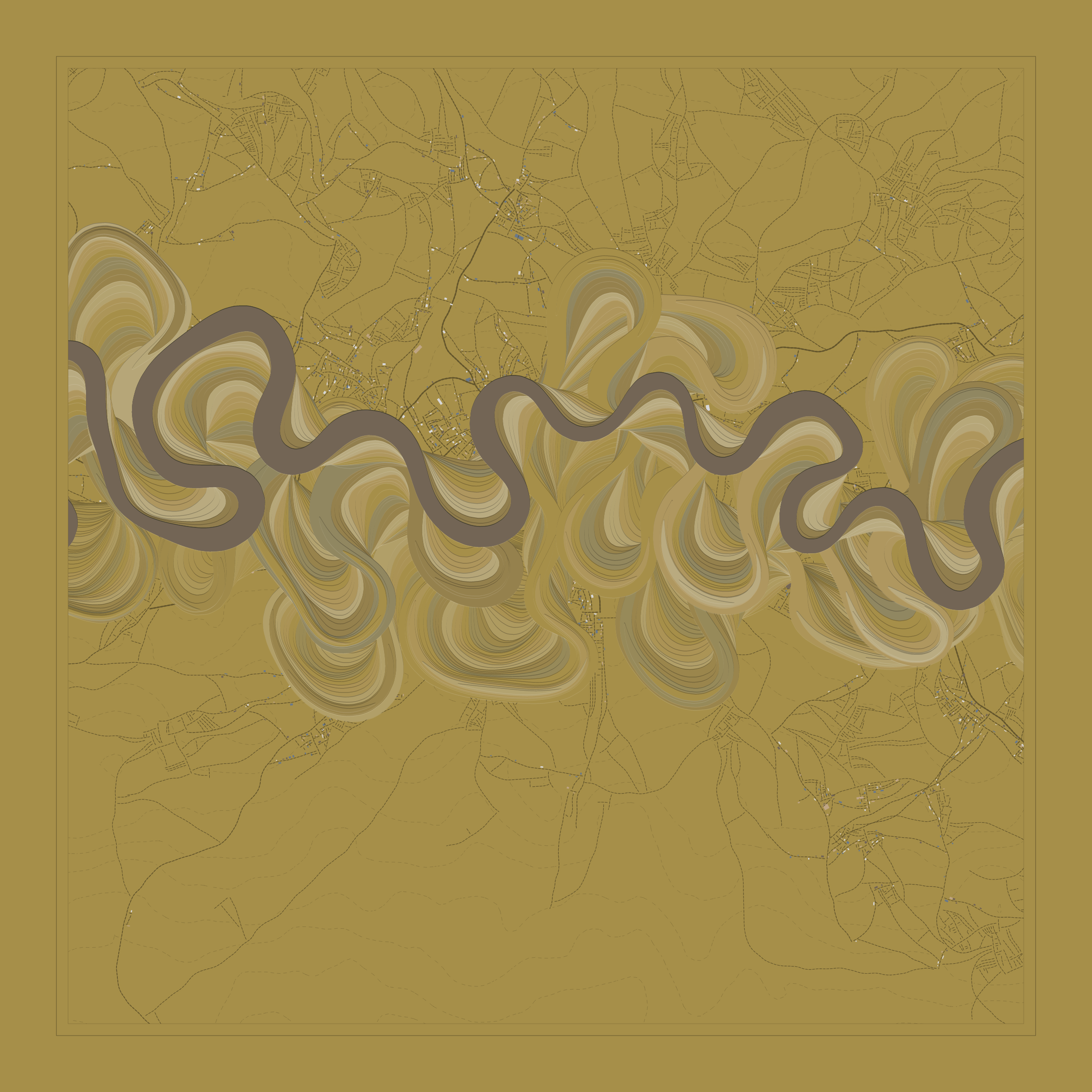 Ancient Courses is a generative experience that explores the aesthetics of meandering rivers and the settlements that form on their banks. The design is graphic and cartographic with bold color palettes rendered against map iconography and line sensibility. From the river banks, roads stretch across the landscape: sometimes a single access road, other times sprawling towns. The river meandering is simulated via a custom algorithm which closely models the real world process.