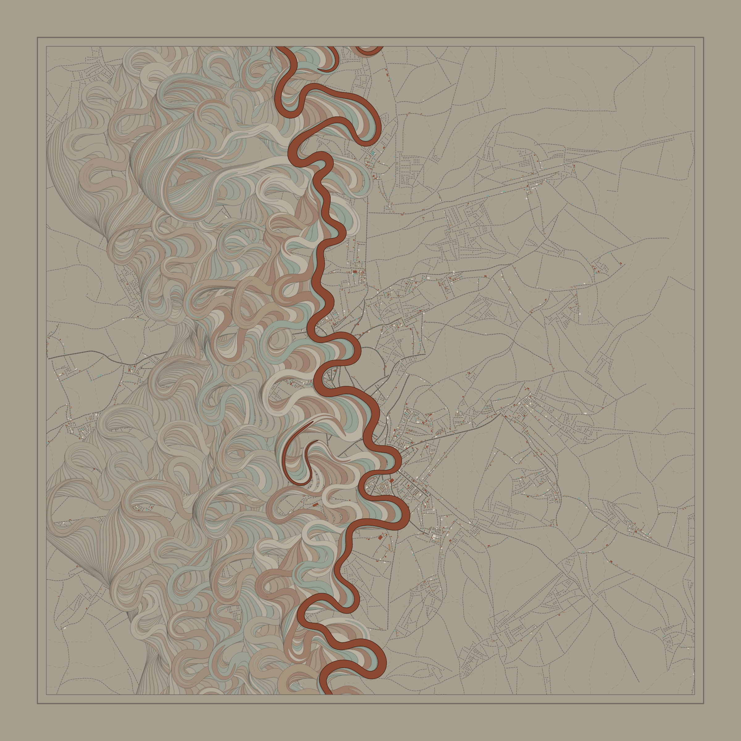 Ancient Courses is a generative experience that explores the aesthetics of meandering rivers and the settlements that form on their banks. The design is graphic and cartographic with bold color palettes rendered against map iconography and line sensibility. From the river banks, roads stretch across the landscape: sometimes a single access road, other times sprawling towns. The river meandering is simulated via a custom algorithm which closely models the real world process.