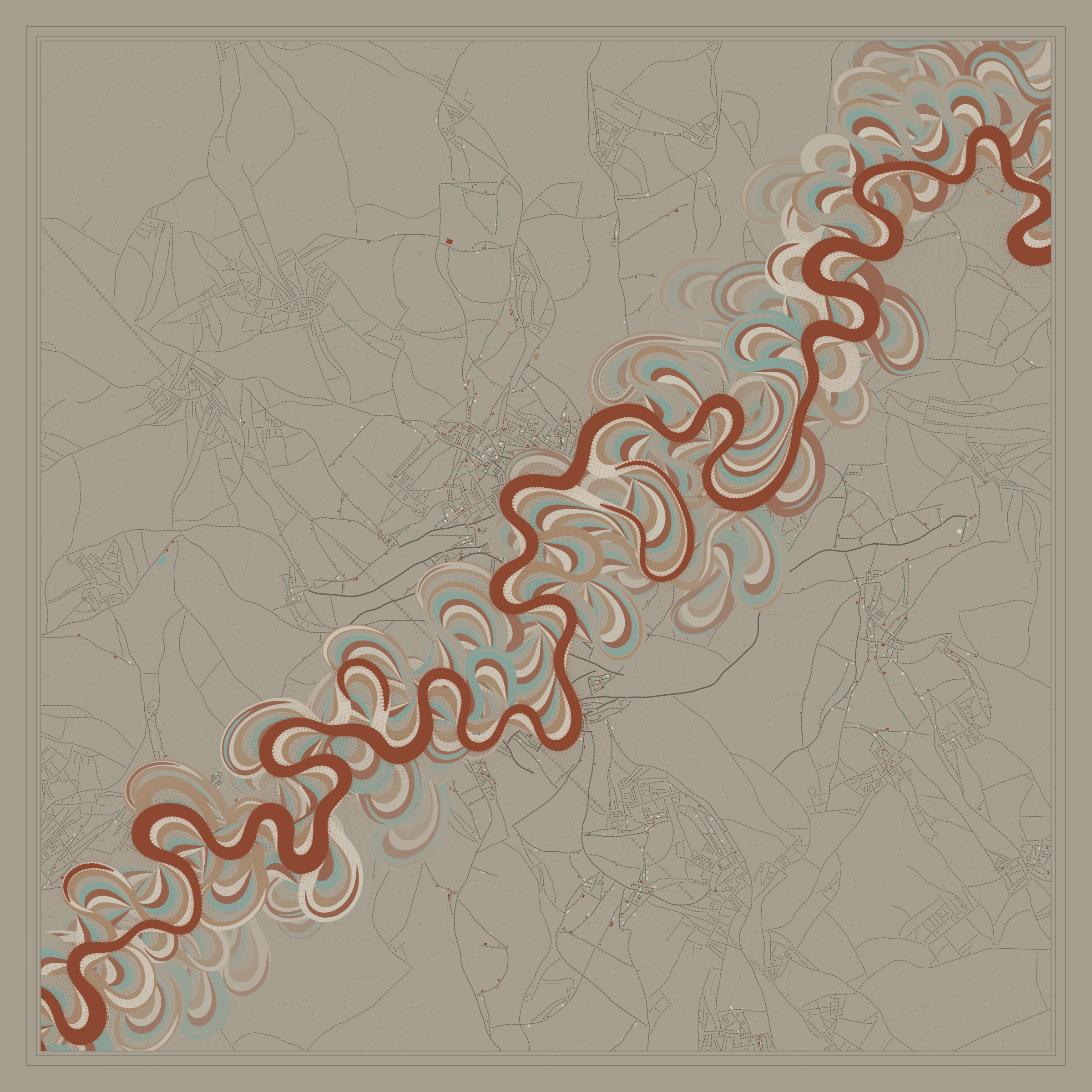 Ancient Courses is a generative experience that explores the aesthetics of meandering rivers and the settlements that form on their banks. The design is graphic and cartographic with bold color palettes rendered against map iconography and line sensibility. From the river banks, roads stretch across the landscape: sometimes a single access road, other times sprawling towns. The river meandering is simulated via a custom algorithm which closely models the real world process.