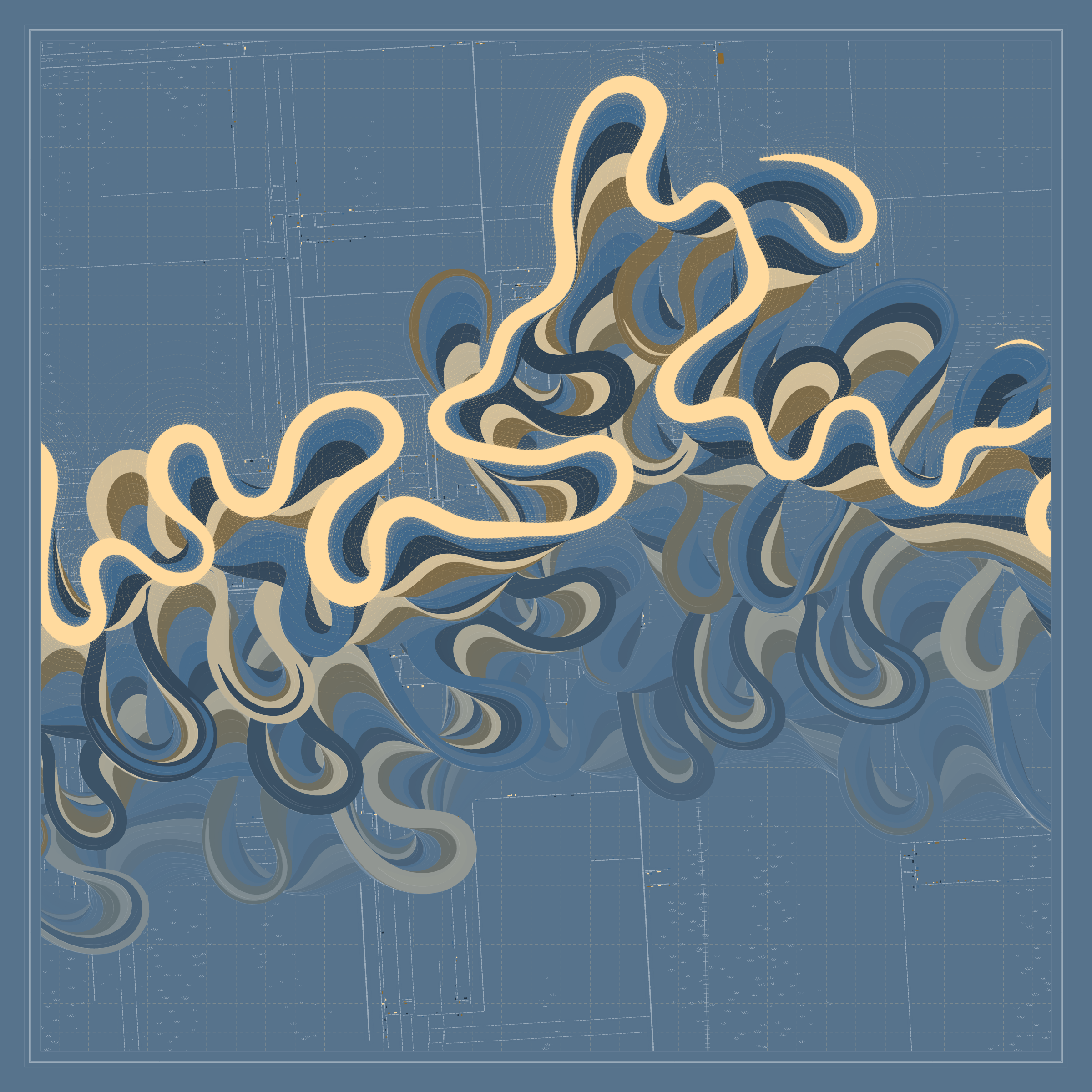 Ancient Courses is a generative experience that explores the aesthetics of meandering rivers and the settlements that form on their banks. The design is graphic and cartographic with bold color palettes rendered against map iconography and line sensibility. From the river banks, roads stretch across the landscape: sometimes a single access road, other times sprawling towns. The river meandering is simulated via a custom algorithm which closely models the real world process.