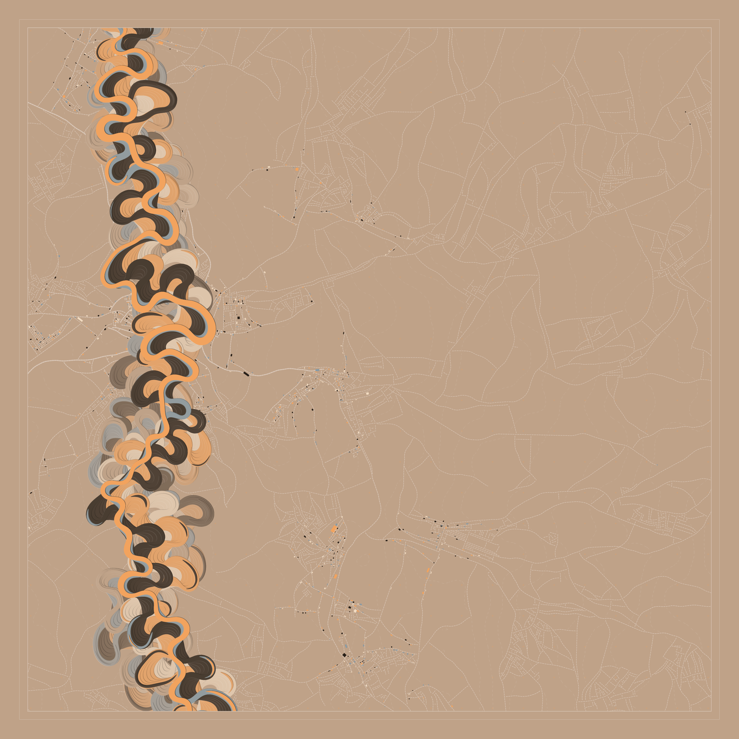 Ancient Courses is a generative experience that explores the aesthetics of meandering rivers and the settlements that form on their banks. The design is graphic and cartographic with bold color palettes rendered against map iconography and line sensibility. From the river banks, roads stretch across the landscape: sometimes a single access road, other times sprawling towns. The river meandering is simulated via a custom algorithm which closely models the real world process.