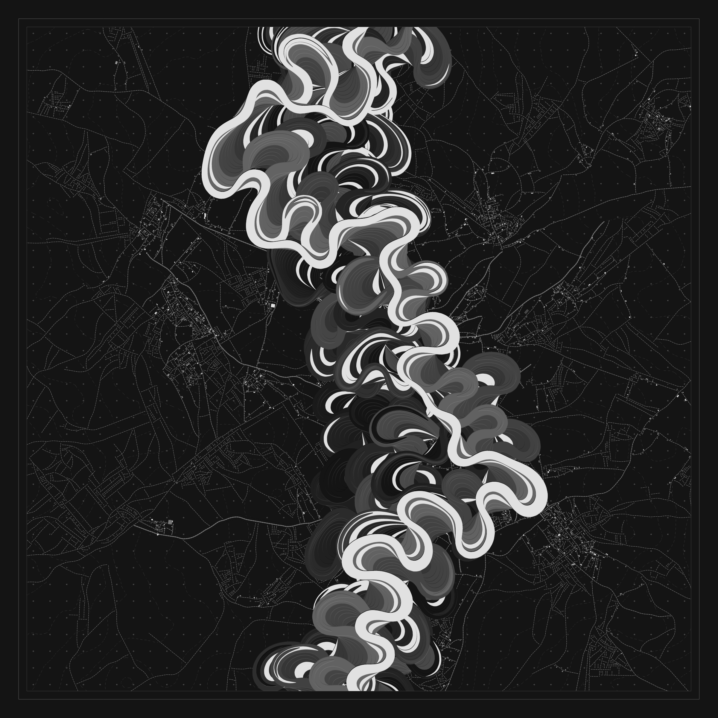 Ancient Courses is a generative experience that explores the aesthetics of meandering rivers and the settlements that form on their banks. The design is graphic and cartographic with bold color palettes rendered against map iconography and line sensibility. From the river banks, roads stretch across the landscape: sometimes a single access road, other times sprawling towns. The river meandering is simulated via a custom algorithm which closely models the real world process.
