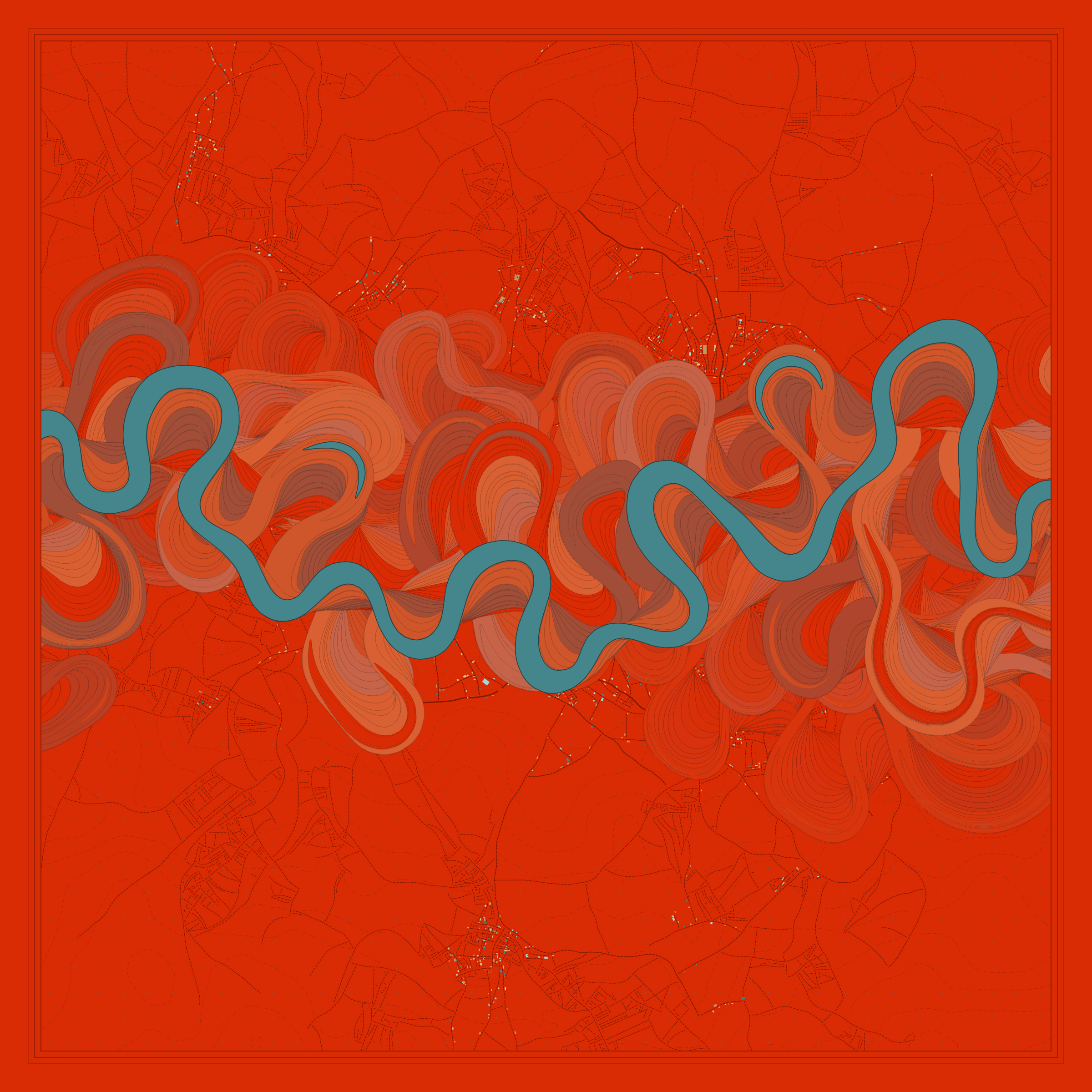 Ancient Courses is a generative experience that explores the aesthetics of meandering rivers and the settlements that form on their banks. The design is graphic and cartographic with bold color palettes rendered against map iconography and line sensibility. From the river banks, roads stretch across the landscape: sometimes a single access road, other times sprawling towns. The river meandering is simulated via a custom algorithm which closely models the real world process.