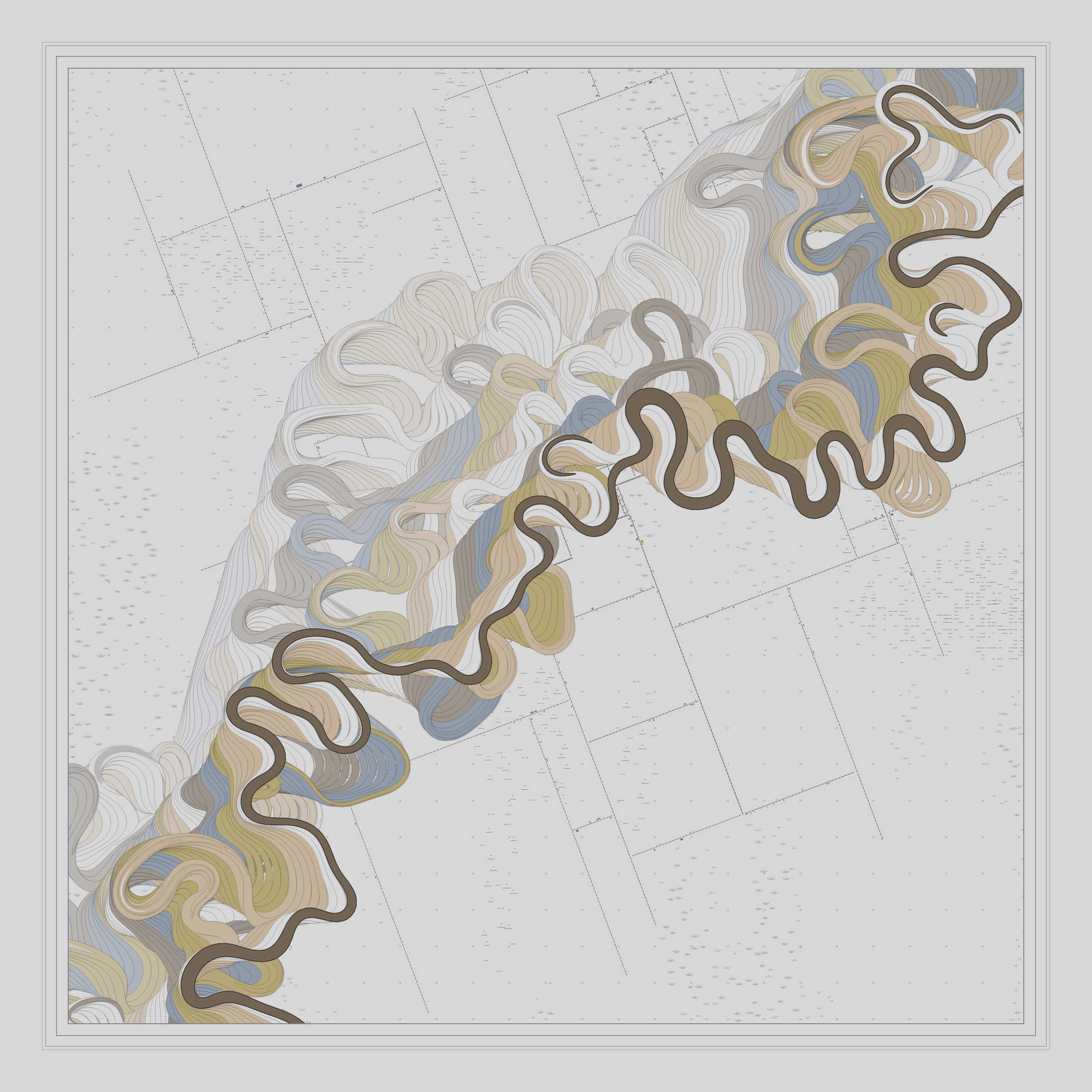 Ancient Courses is a generative experience that explores the aesthetics of meandering rivers and the settlements that form on their banks. The design is graphic and cartographic with bold color palettes rendered against map iconography and line sensibility. From the river banks, roads stretch across the landscape: sometimes a single access road, other times sprawling towns. The river meandering is simulated via a custom algorithm which closely models the real world process.