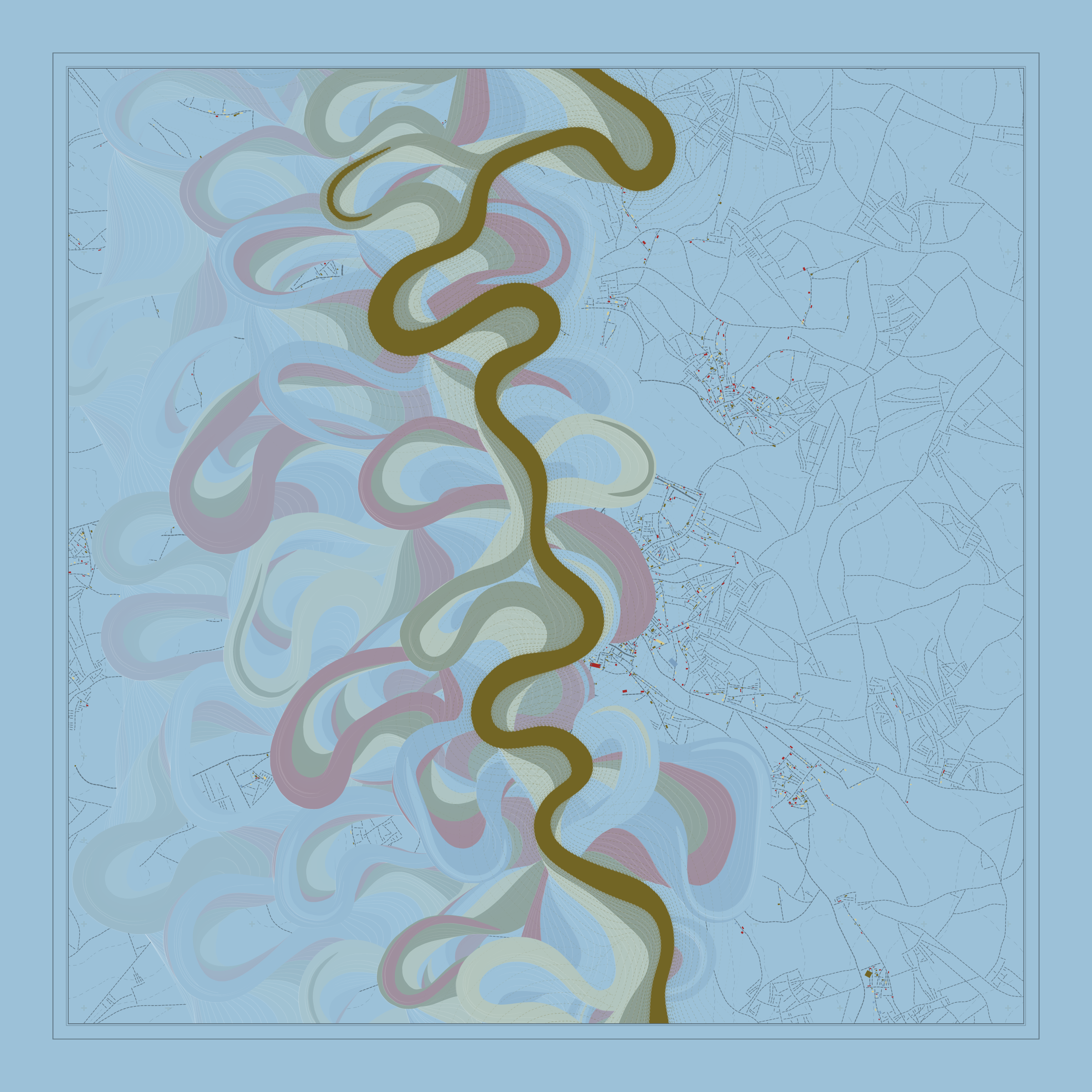 Ancient Courses is a generative experience that explores the aesthetics of meandering rivers and the settlements that form on their banks. The design is graphic and cartographic with bold color palettes rendered against map iconography and line sensibility. From the river banks, roads stretch across the landscape: sometimes a single access road, other times sprawling towns. The river meandering is simulated via a custom algorithm which closely models the real world process.