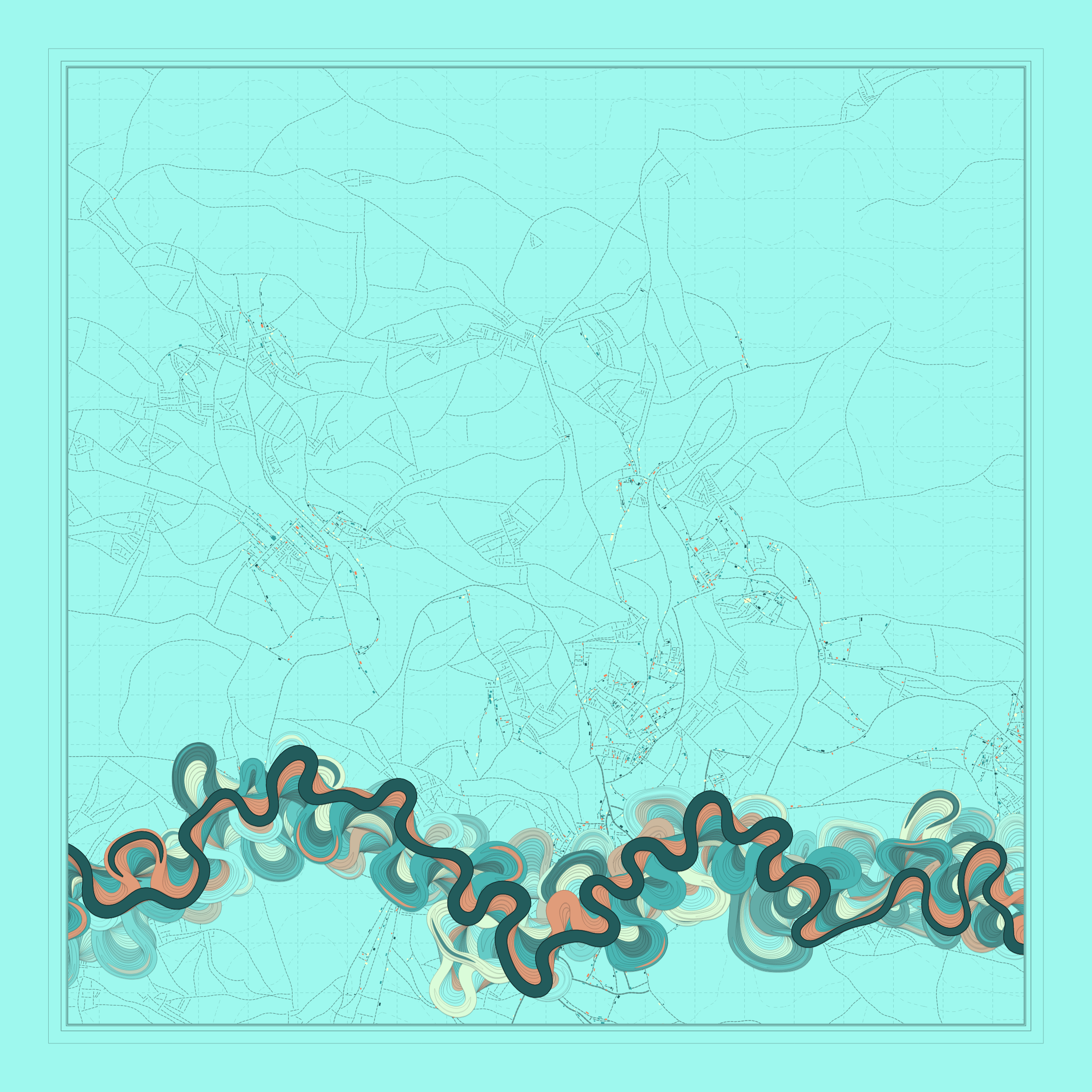 Ancient Courses is a generative experience that explores the aesthetics of meandering rivers and the settlements that form on their banks. The design is graphic and cartographic with bold color palettes rendered against map iconography and line sensibility. From the river banks, roads stretch across the landscape: sometimes a single access road, other times sprawling towns. The river meandering is simulated via a custom algorithm which closely models the real world process.