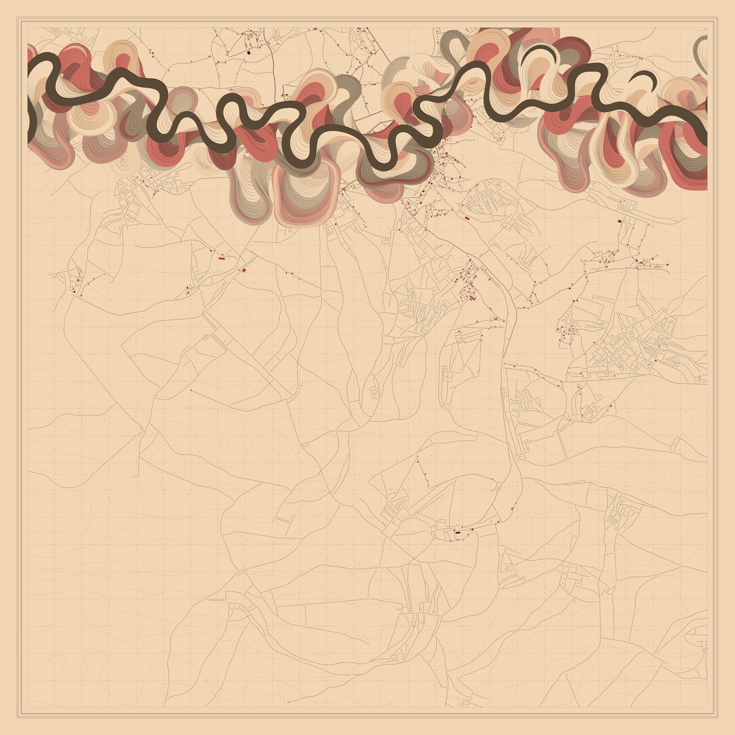 Ancient Courses is a generative experience that explores the aesthetics of meandering rivers and the settlements that form on their banks. The design is graphic and cartographic with bold color palettes rendered against map iconography and line sensibility. From the river banks, roads stretch across the landscape: sometimes a single access road, other times sprawling towns. The river meandering is simulated via a custom algorithm which closely models the real world process.