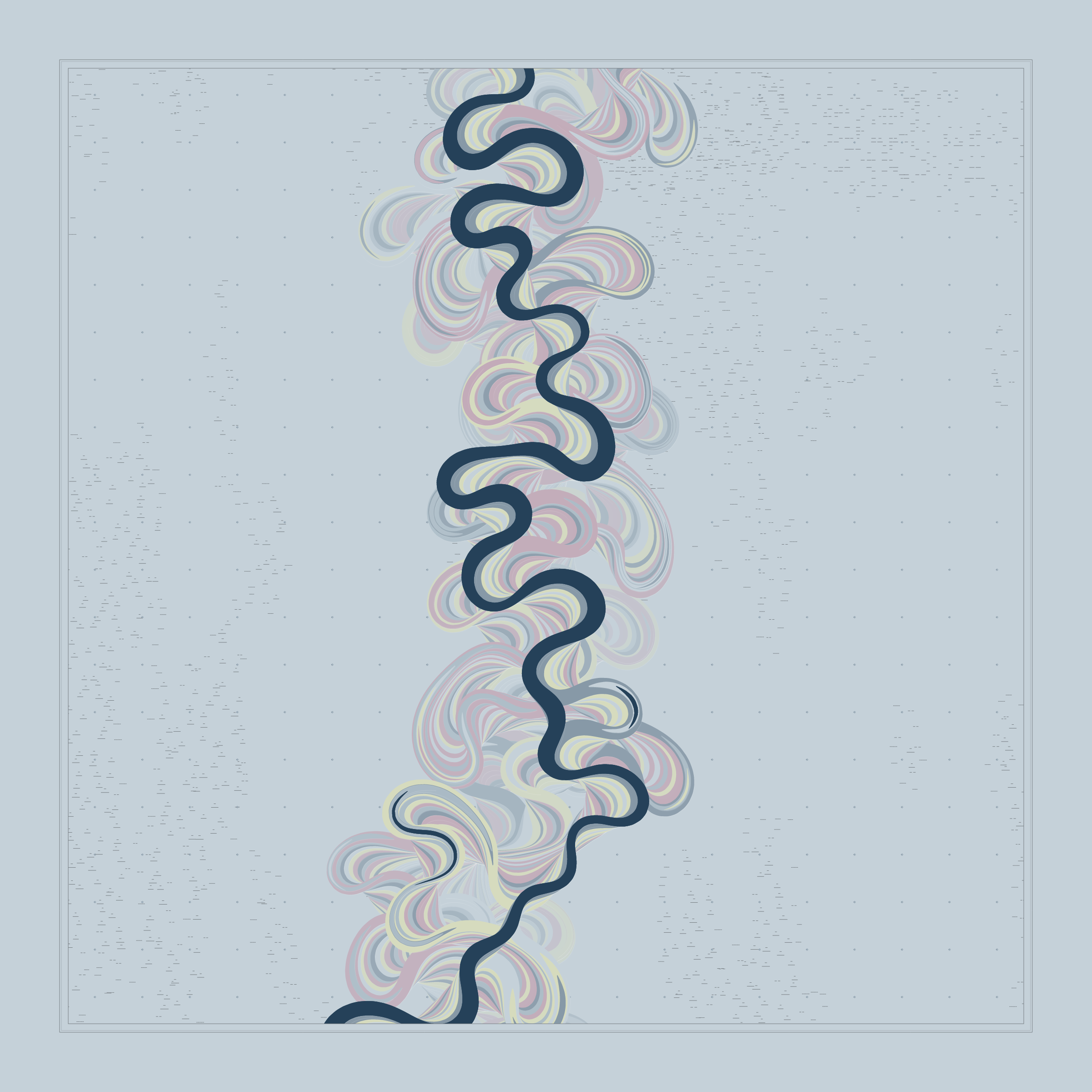 Ancient Courses is a generative experience that explores the aesthetics of meandering rivers and the settlements that form on their banks. The design is graphic and cartographic with bold color palettes rendered against map iconography and line sensibility. From the river banks, roads stretch across the landscape: sometimes a single access road, other times sprawling towns. The river meandering is simulated via a custom algorithm which closely models the real world process.