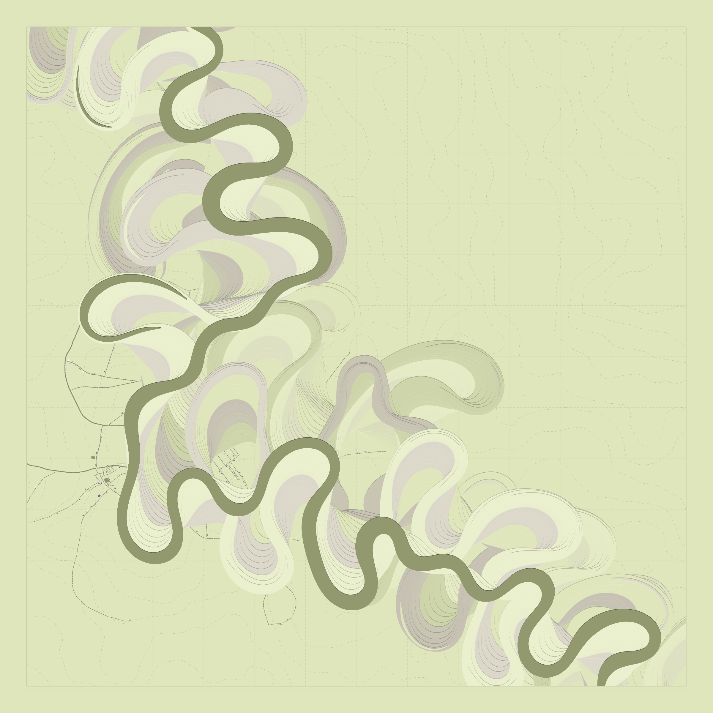 Ancient Courses is a generative experience that explores the aesthetics of meandering rivers and the settlements that form on their banks. The design is graphic and cartographic with bold color palettes rendered against map iconography and line sensibility. From the river banks, roads stretch across the landscape: sometimes a single access road, other times sprawling towns. The river meandering is simulated via a custom algorithm which closely models the real world process.