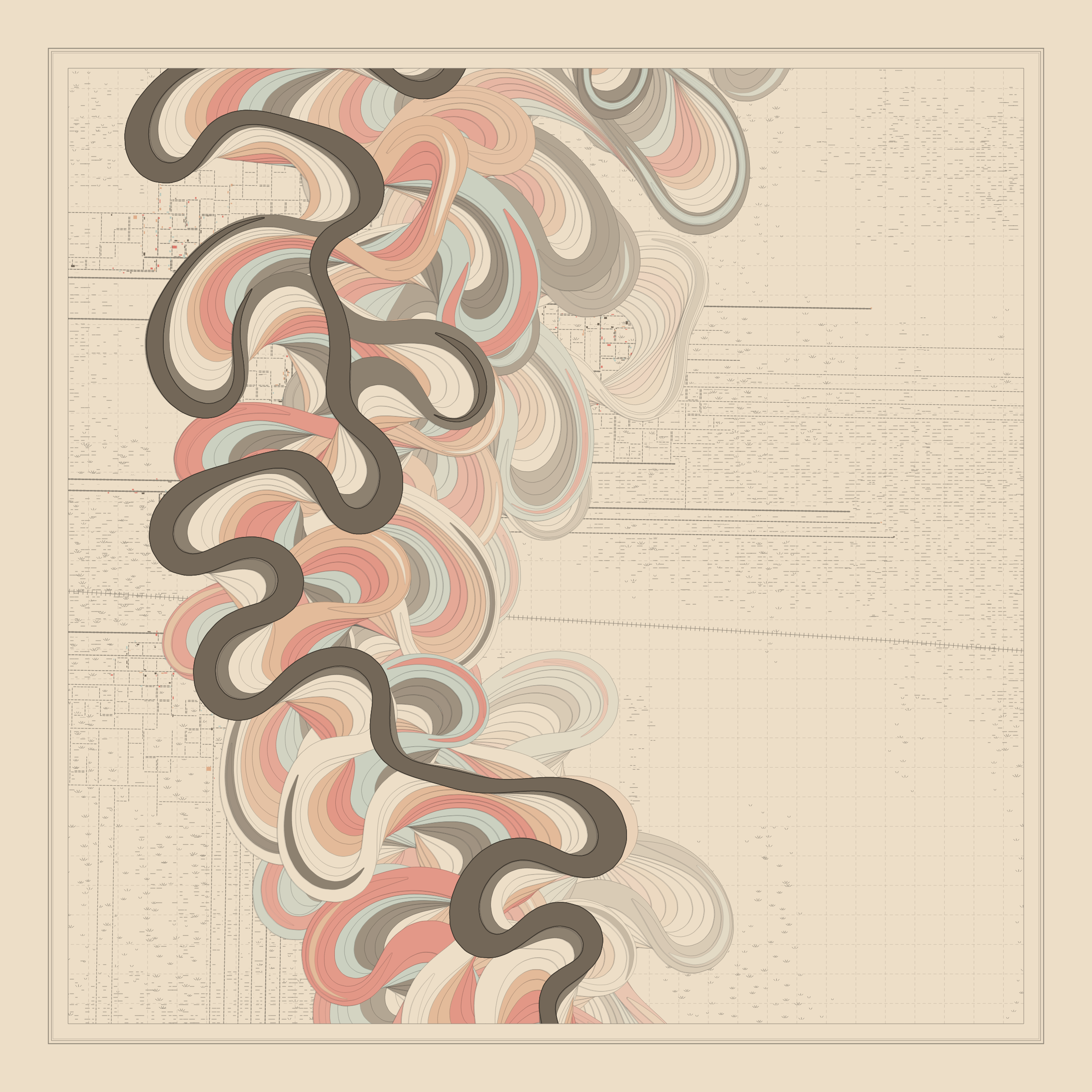 Ancient Courses is a generative experience that explores the aesthetics of meandering rivers and the settlements that form on their banks. The design is graphic and cartographic with bold color palettes rendered against map iconography and line sensibility. From the river banks, roads stretch across the landscape: sometimes a single access road, other times sprawling towns. The river meandering is simulated via a custom algorithm which closely models the real world process.