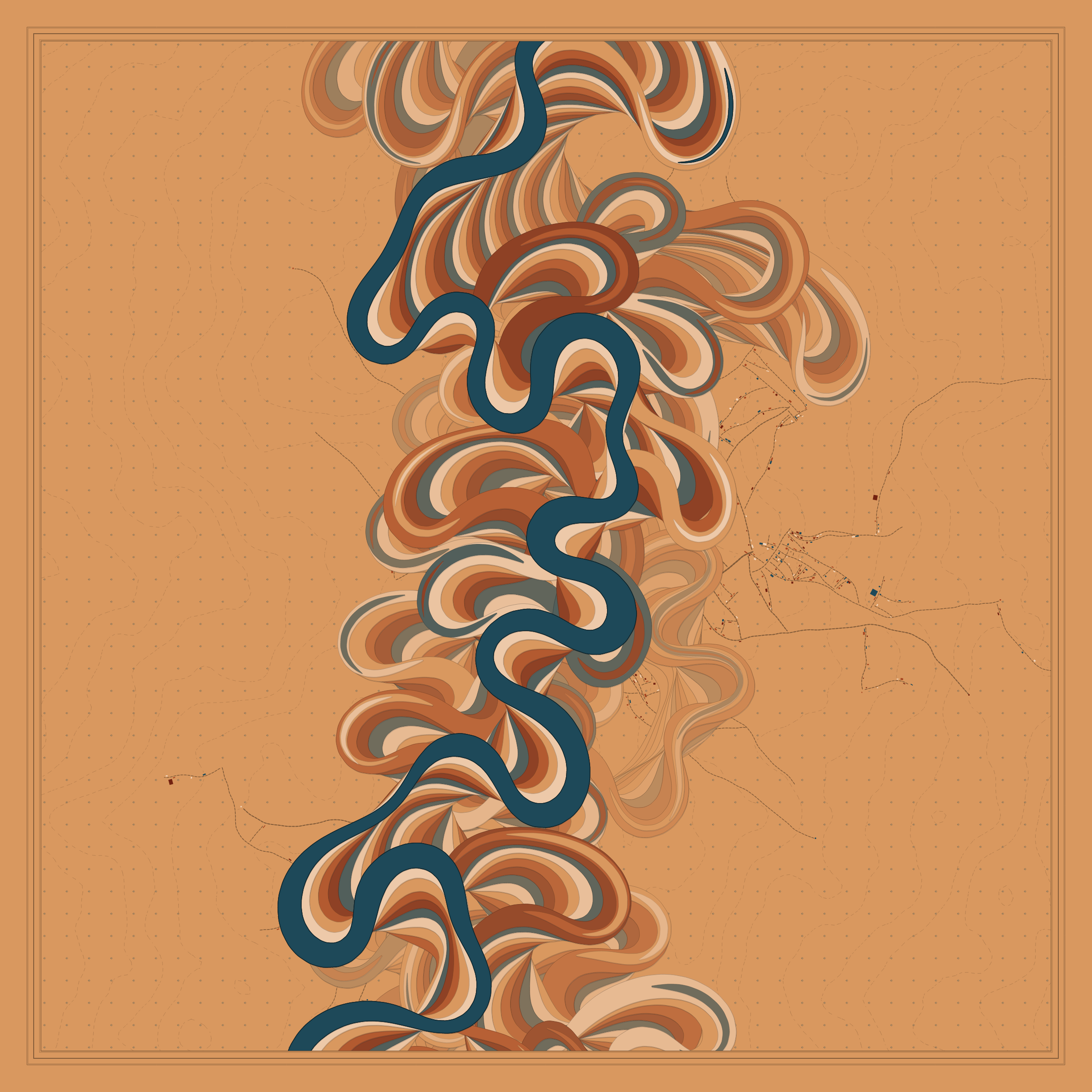 Ancient Courses is a generative experience that explores the aesthetics of meandering rivers and the settlements that form on their banks. The design is graphic and cartographic with bold color palettes rendered against map iconography and line sensibility. From the river banks, roads stretch across the landscape: sometimes a single access road, other times sprawling towns. The river meandering is simulated via a custom algorithm which closely models the real world process.