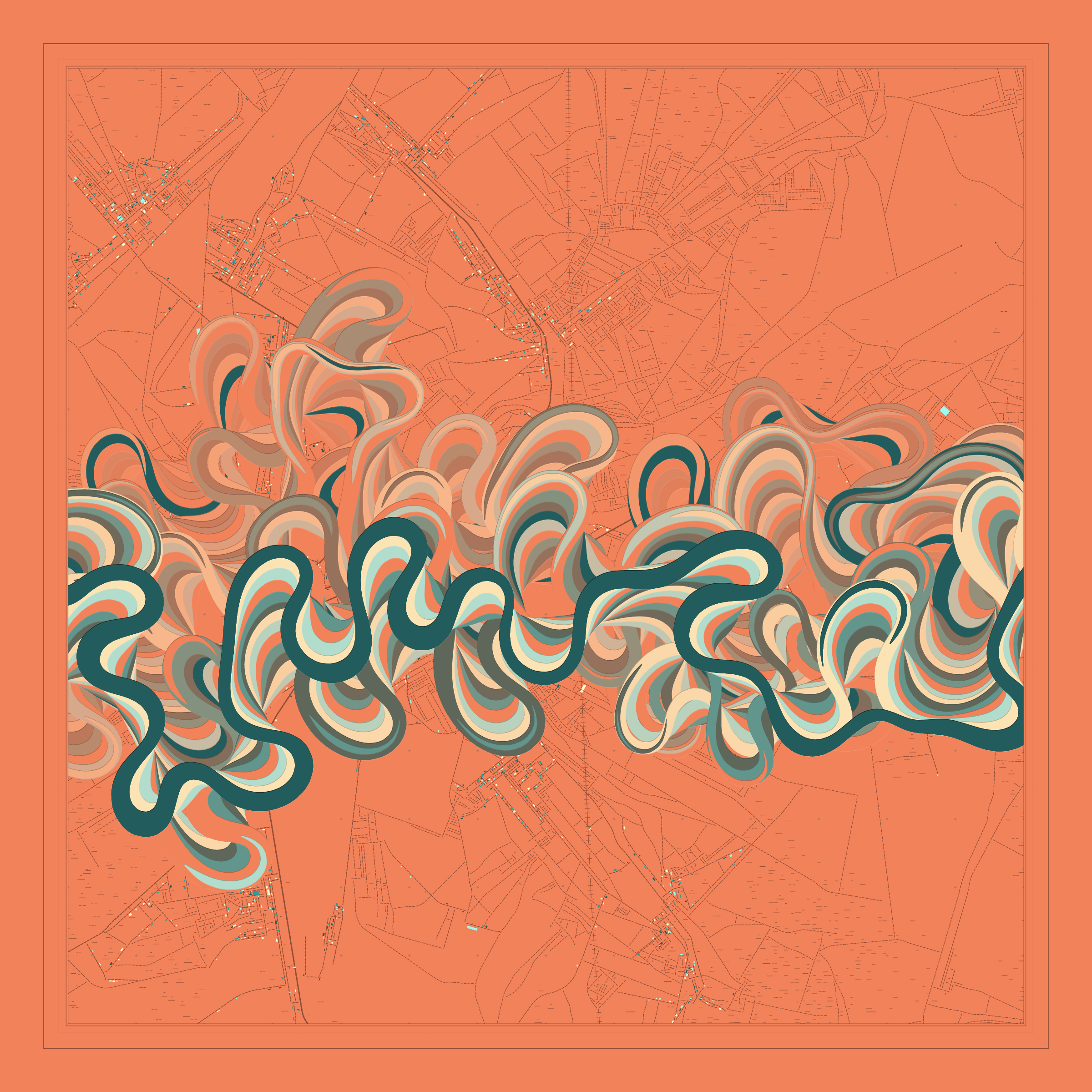 Ancient Courses is a generative experience that explores the aesthetics of meandering rivers and the settlements that form on their banks. The design is graphic and cartographic with bold color palettes rendered against map iconography and line sensibility. From the river banks, roads stretch across the landscape: sometimes a single access road, other times sprawling towns. The river meandering is simulated via a custom algorithm which closely models the real world process.
