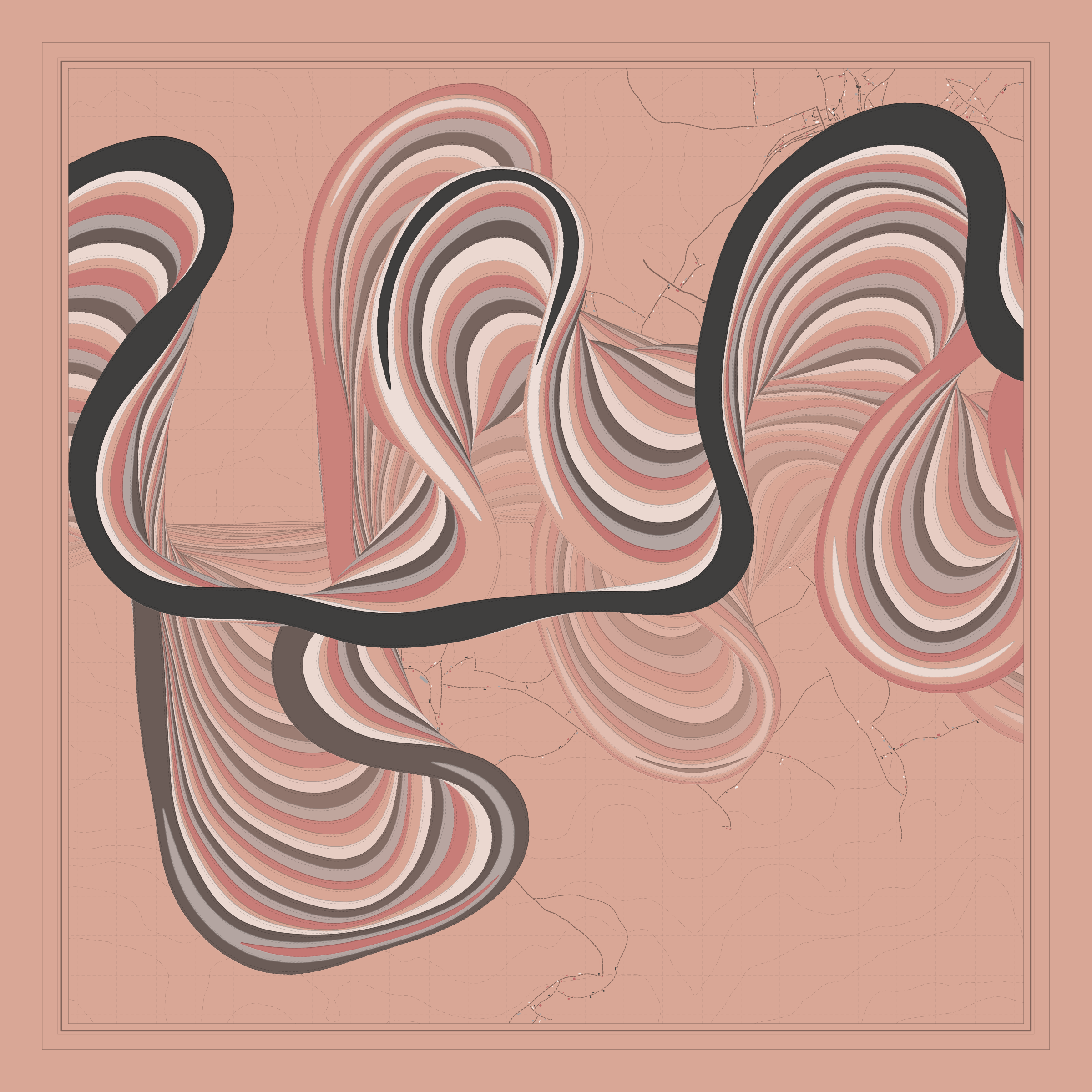 Ancient Courses is a generative experience that explores the aesthetics of meandering rivers and the settlements that form on their banks. The design is graphic and cartographic with bold color palettes rendered against map iconography and line sensibility. From the river banks, roads stretch across the landscape: sometimes a single access road, other times sprawling towns. The river meandering is simulated via a custom algorithm which closely models the real world process.
