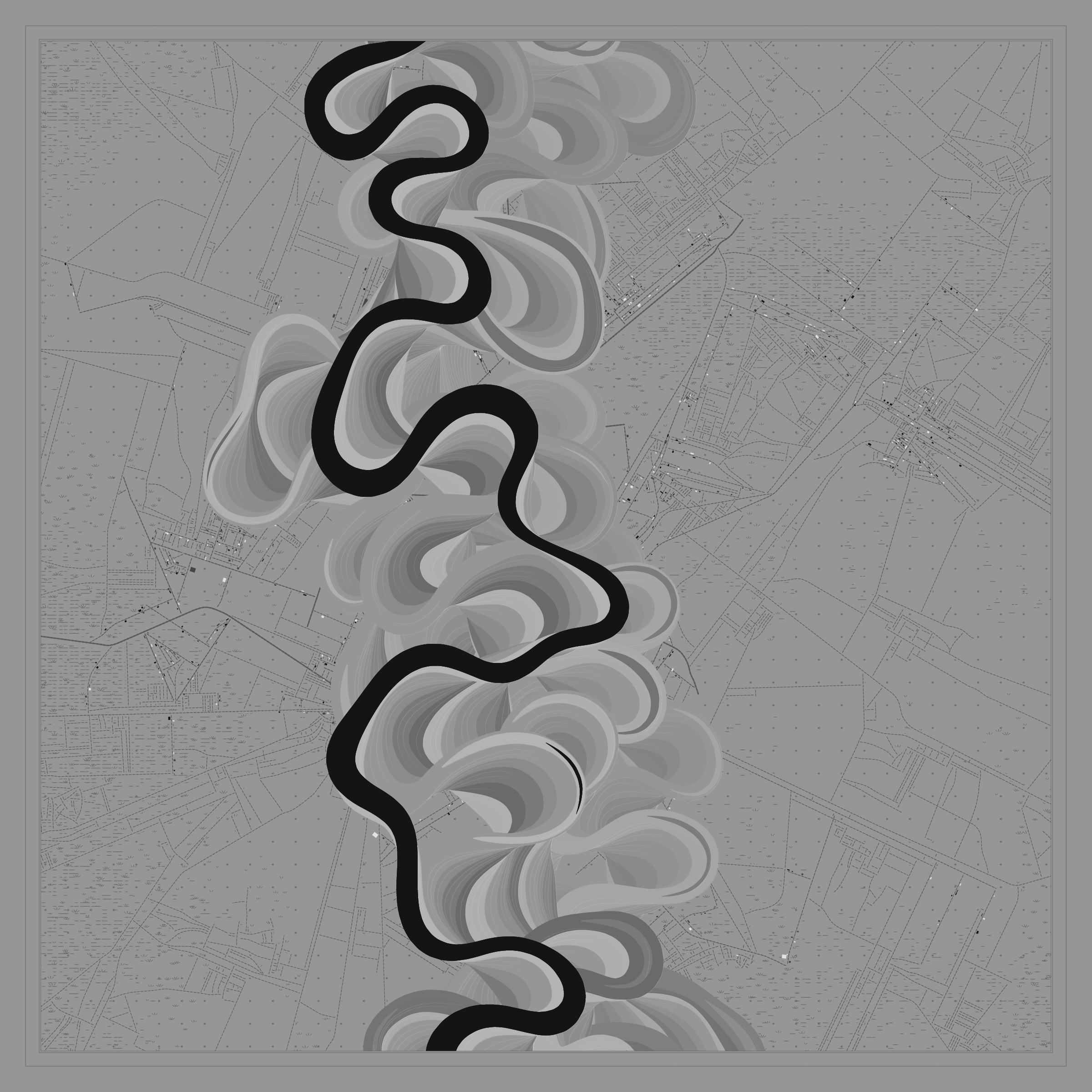Ancient Courses is a generative experience that explores the aesthetics of meandering rivers and the settlements that form on their banks. The design is graphic and cartographic with bold color palettes rendered against map iconography and line sensibility. From the river banks, roads stretch across the landscape: sometimes a single access road, other times sprawling towns. The river meandering is simulated via a custom algorithm which closely models the real world process.