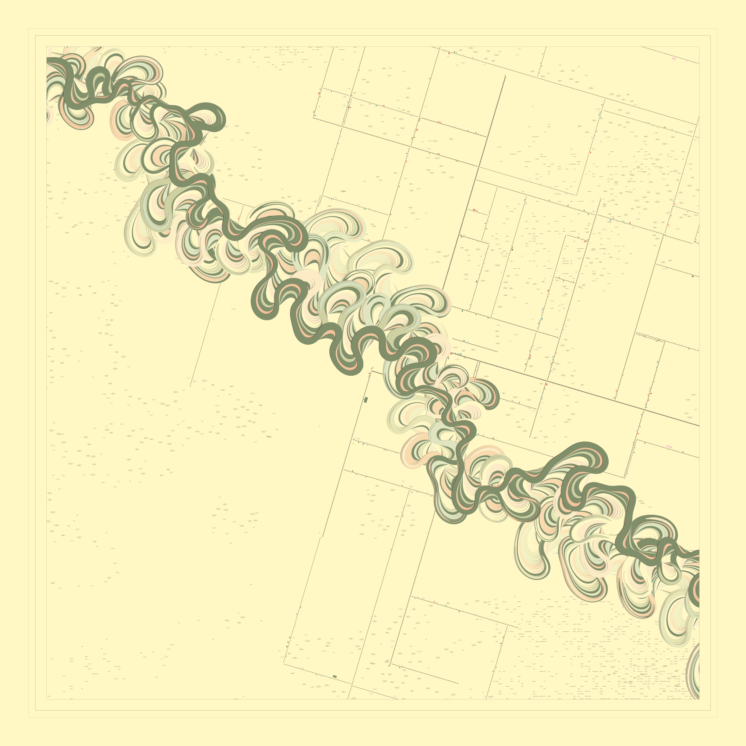 Ancient Courses is a generative experience that explores the aesthetics of meandering rivers and the settlements that form on their banks. The design is graphic and cartographic with bold color palettes rendered against map iconography and line sensibility. From the river banks, roads stretch across the landscape: sometimes a single access road, other times sprawling towns. The river meandering is simulated via a custom algorithm which closely models the real world process.