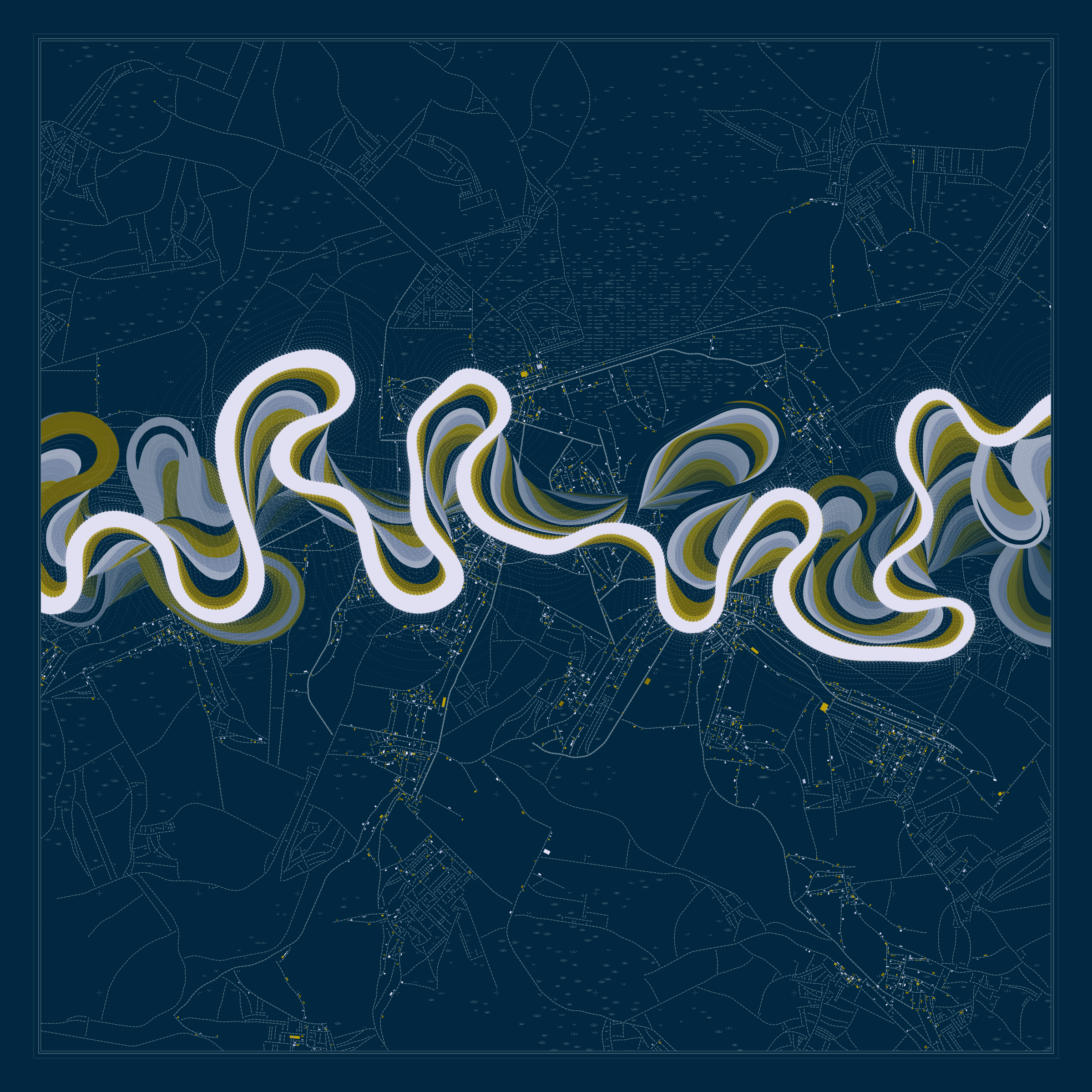 Ancient Courses is a generative experience that explores the aesthetics of meandering rivers and the settlements that form on their banks. The design is graphic and cartographic with bold color palettes rendered against map iconography and line sensibility. From the river banks, roads stretch across the landscape: sometimes a single access road, other times sprawling towns. The river meandering is simulated via a custom algorithm which closely models the real world process.