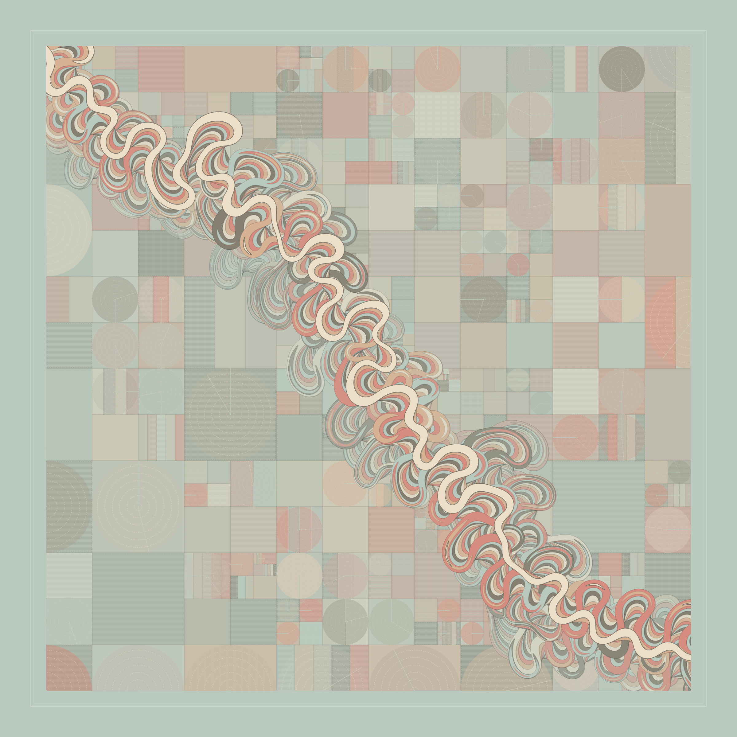 Ancient Courses is a generative experience that explores the aesthetics of meandering rivers and the settlements that form on their banks. The design is graphic and cartographic with bold color palettes rendered against map iconography and line sensibility. From the river banks, roads stretch across the landscape: sometimes a single access road, other times sprawling towns. The river meandering is simulated via a custom algorithm which closely models the real world process.