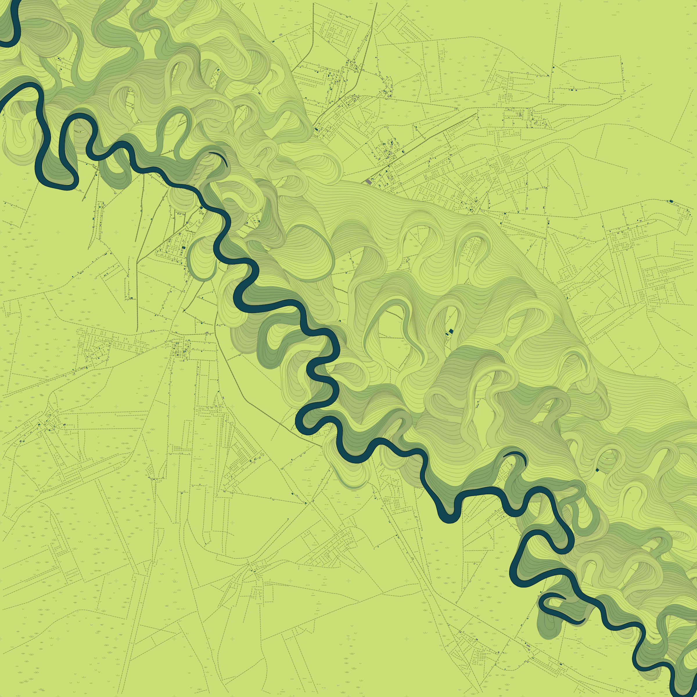 Ancient Courses is a generative experience that explores the aesthetics of meandering rivers and the settlements that form on their banks. The design is graphic and cartographic with bold color palettes rendered against map iconography and line sensibility. From the river banks, roads stretch across the landscape: sometimes a single access road, other times sprawling towns. The river meandering is simulated via a custom algorithm which closely models the real world process.