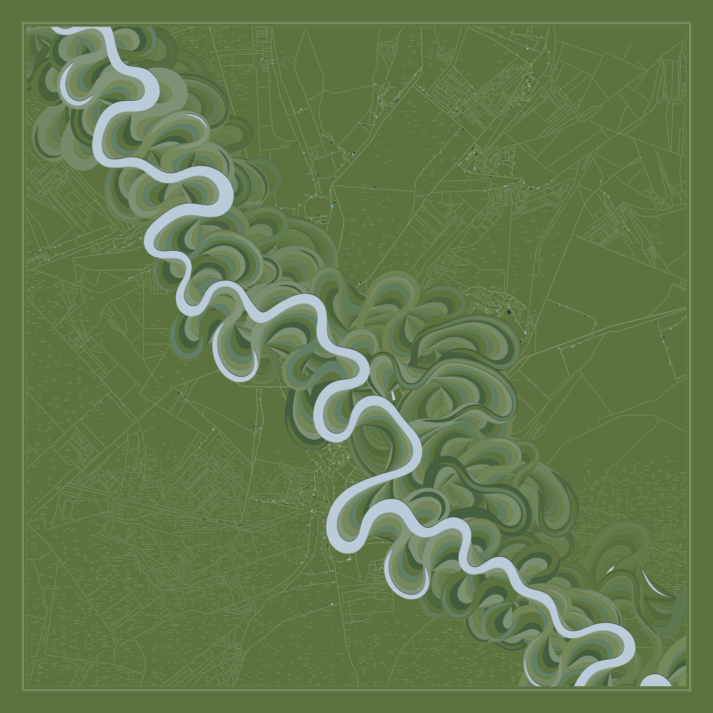 Ancient Courses is a generative experience that explores the aesthetics of meandering rivers and the settlements that form on their banks. The design is graphic and cartographic with bold color palettes rendered against map iconography and line sensibility. From the river banks, roads stretch across the landscape: sometimes a single access road, other times sprawling towns. The river meandering is simulated via a custom algorithm which closely models the real world process.