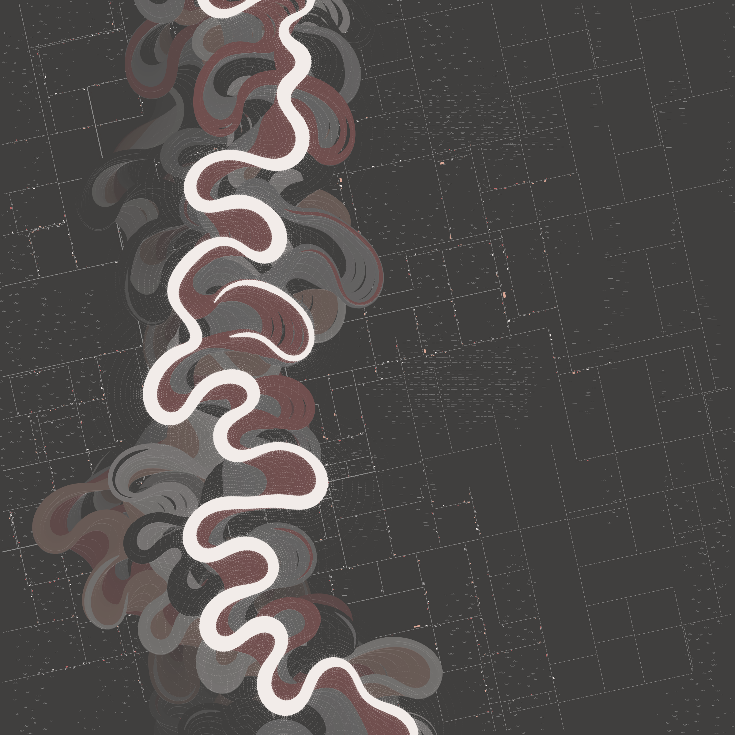 Ancient Courses is a generative experience that explores the aesthetics of meandering rivers and the settlements that form on their banks. The design is graphic and cartographic with bold color palettes rendered against map iconography and line sensibility. From the river banks, roads stretch across the landscape: sometimes a single access road, other times sprawling towns. The river meandering is simulated via a custom algorithm which closely models the real world process.