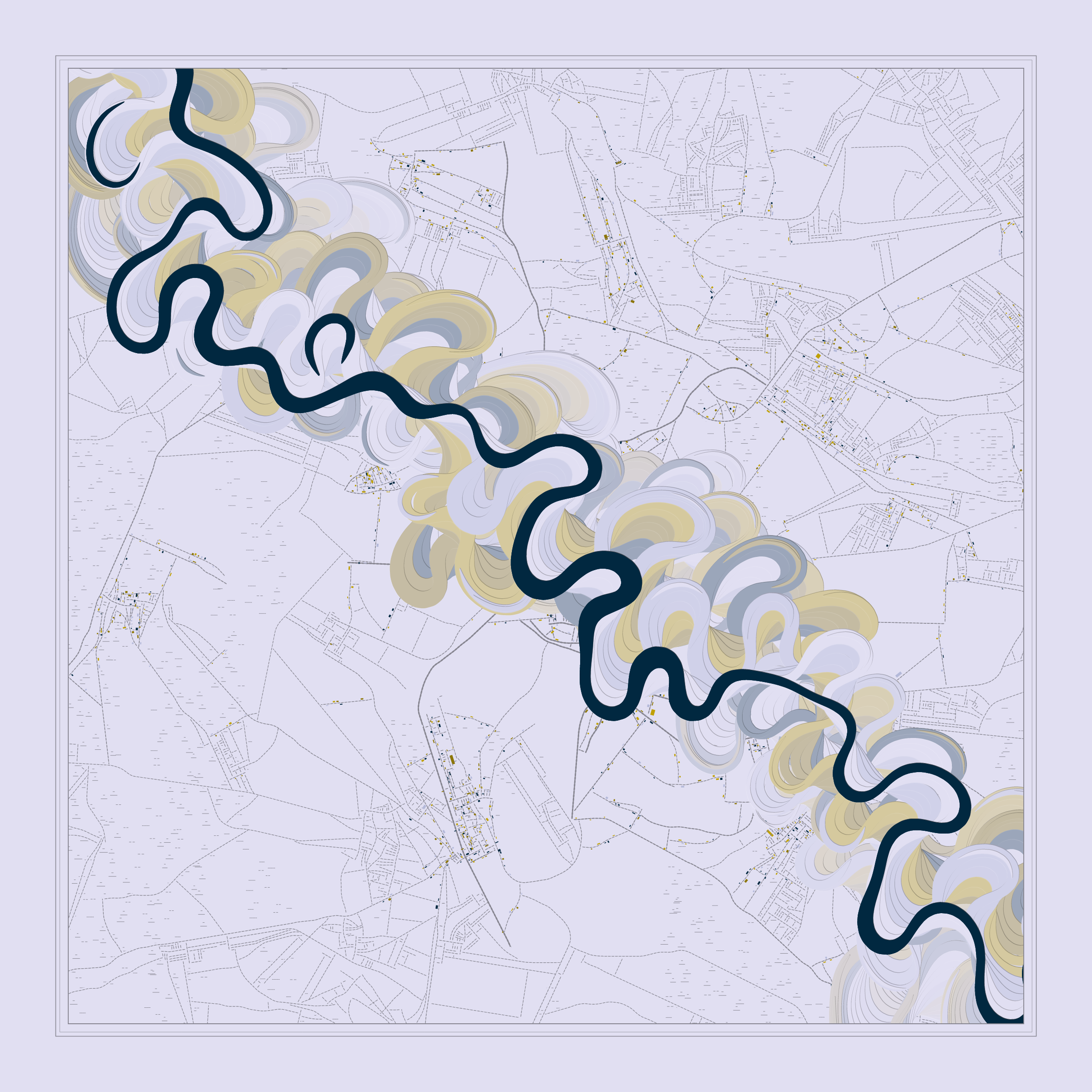 Ancient Courses is a generative experience that explores the aesthetics of meandering rivers and the settlements that form on their banks. The design is graphic and cartographic with bold color palettes rendered against map iconography and line sensibility. From the river banks, roads stretch across the landscape: sometimes a single access road, other times sprawling towns. The river meandering is simulated via a custom algorithm which closely models the real world process.