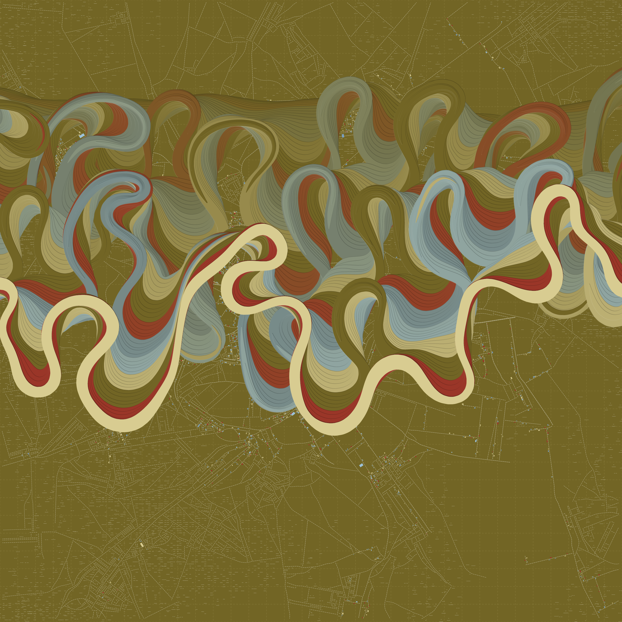 Ancient Courses is a generative experience that explores the aesthetics of meandering rivers and the settlements that form on their banks. The design is graphic and cartographic with bold color palettes rendered against map iconography and line sensibility. From the river banks, roads stretch across the landscape: sometimes a single access road, other times sprawling towns. The river meandering is simulated via a custom algorithm which closely models the real world process.