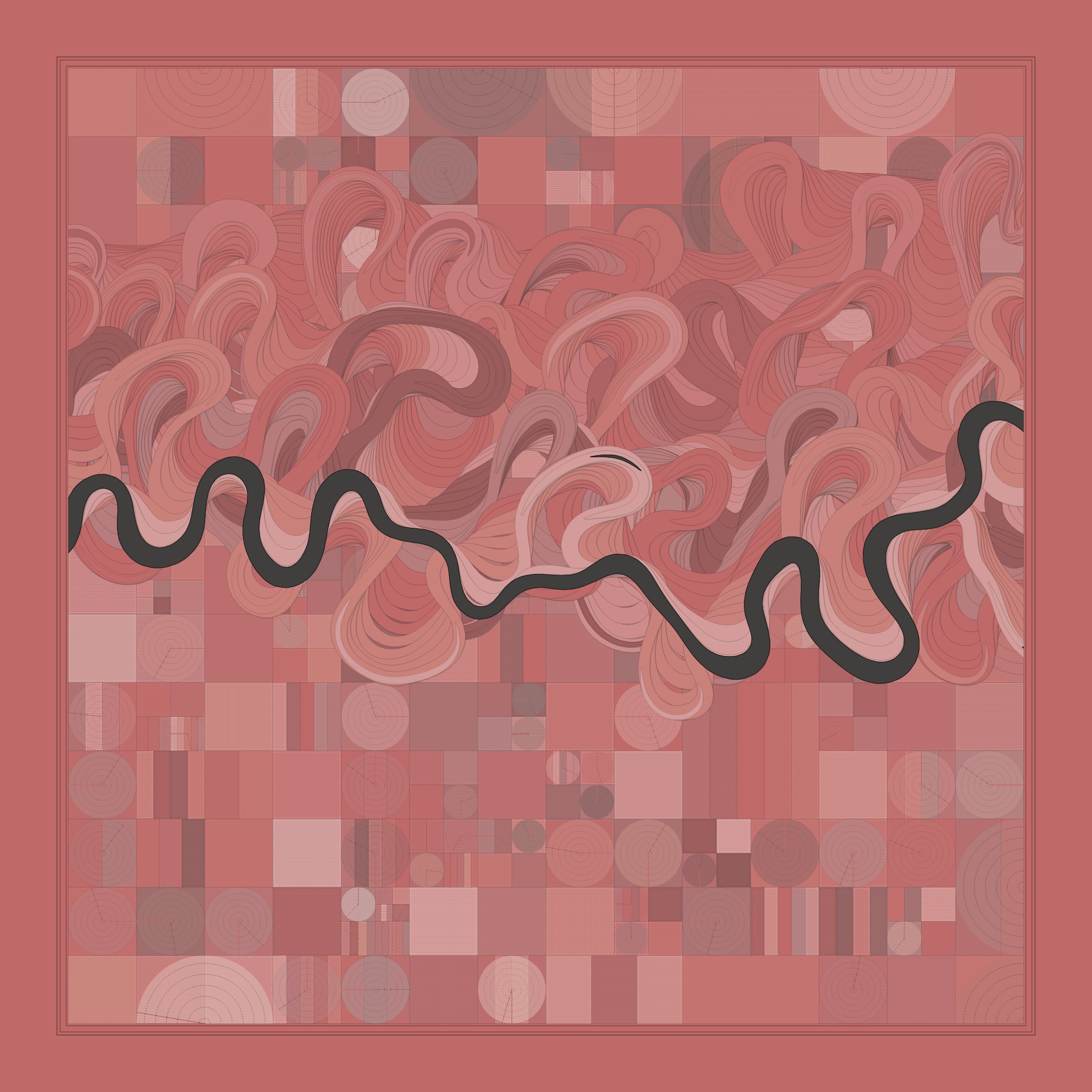 Ancient Courses is a generative experience that explores the aesthetics of meandering rivers and the settlements that form on their banks. The design is graphic and cartographic with bold color palettes rendered against map iconography and line sensibility. From the river banks, roads stretch across the landscape: sometimes a single access road, other times sprawling towns. The river meandering is simulated via a custom algorithm which closely models the real world process.