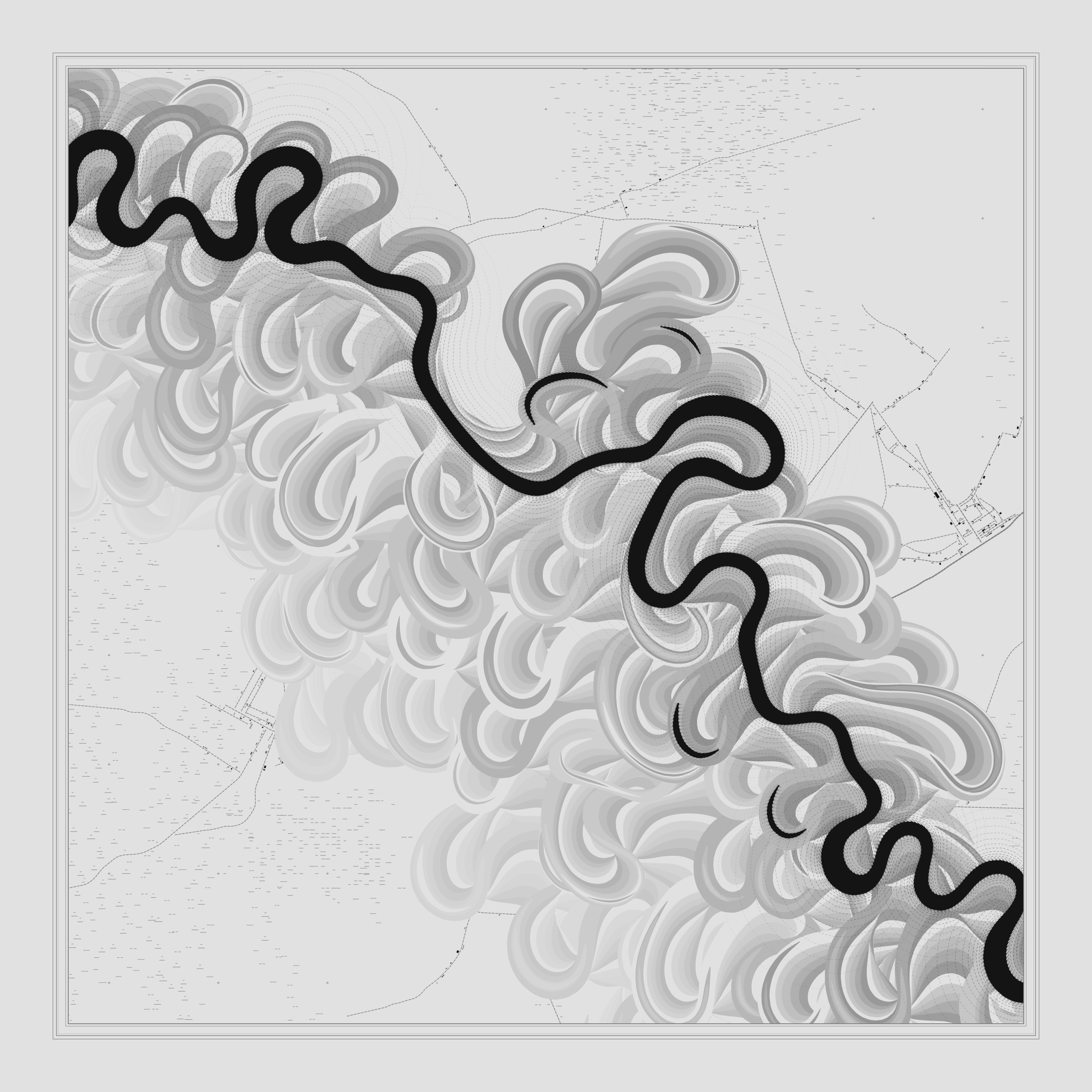 Ancient Courses is a generative experience that explores the aesthetics of meandering rivers and the settlements that form on their banks. The design is graphic and cartographic with bold color palettes rendered against map iconography and line sensibility. From the river banks, roads stretch across the landscape: sometimes a single access road, other times sprawling towns. The river meandering is simulated via a custom algorithm which closely models the real world process.