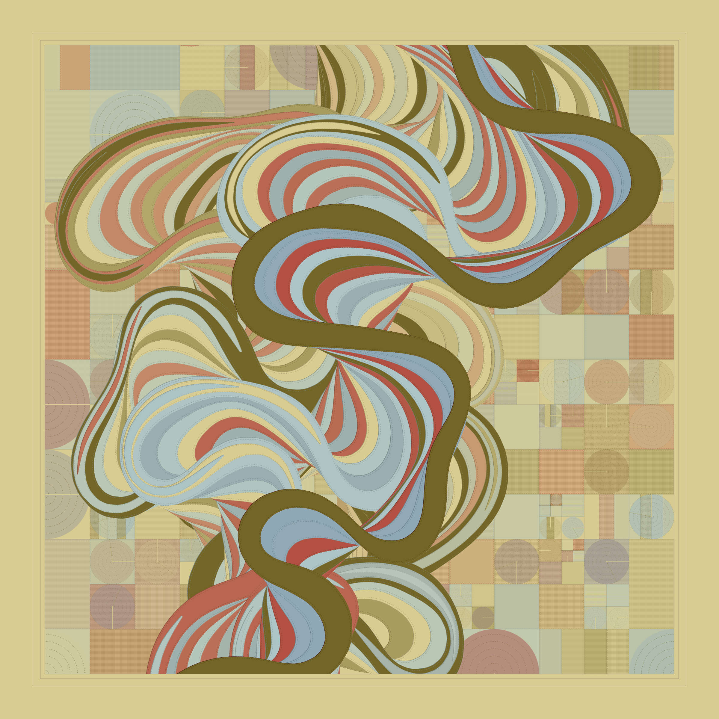 Ancient Courses is a generative experience that explores the aesthetics of meandering rivers and the settlements that form on their banks. The design is graphic and cartographic with bold color palettes rendered against map iconography and line sensibility. From the river banks, roads stretch across the landscape: sometimes a single access road, other times sprawling towns. The river meandering is simulated via a custom algorithm which closely models the real world process.