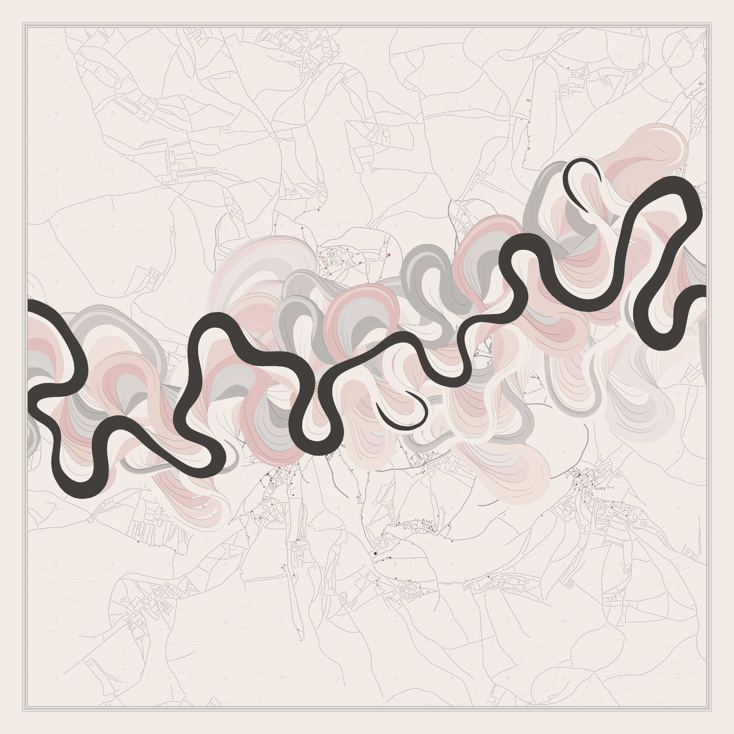 Ancient Courses is a generative experience that explores the aesthetics of meandering rivers and the settlements that form on their banks. The design is graphic and cartographic with bold color palettes rendered against map iconography and line sensibility. From the river banks, roads stretch across the landscape: sometimes a single access road, other times sprawling towns. The river meandering is simulated via a custom algorithm which closely models the real world process.