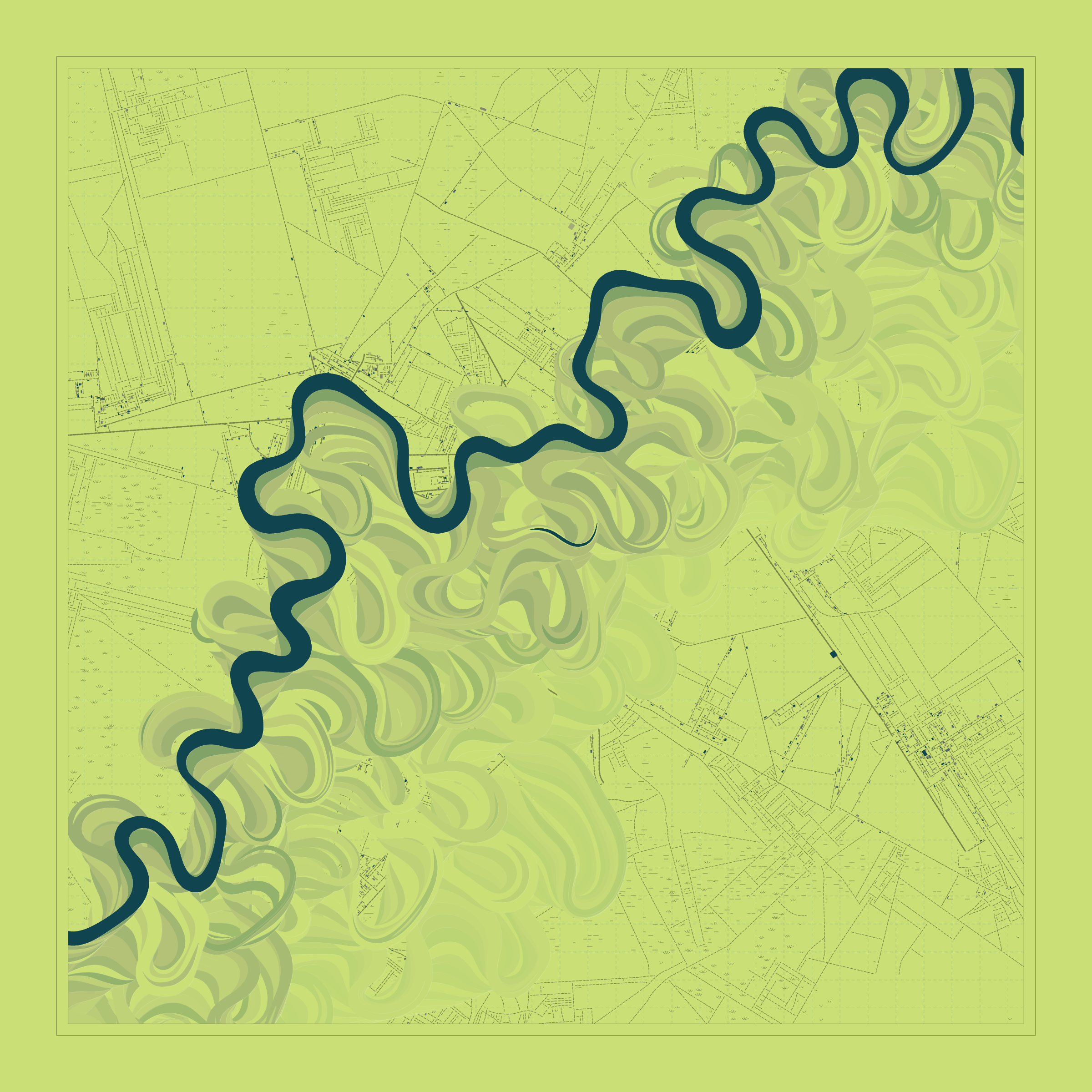 Ancient Courses is a generative experience that explores the aesthetics of meandering rivers and the settlements that form on their banks. The design is graphic and cartographic with bold color palettes rendered against map iconography and line sensibility. From the river banks, roads stretch across the landscape: sometimes a single access road, other times sprawling towns. The river meandering is simulated via a custom algorithm which closely models the real world process.