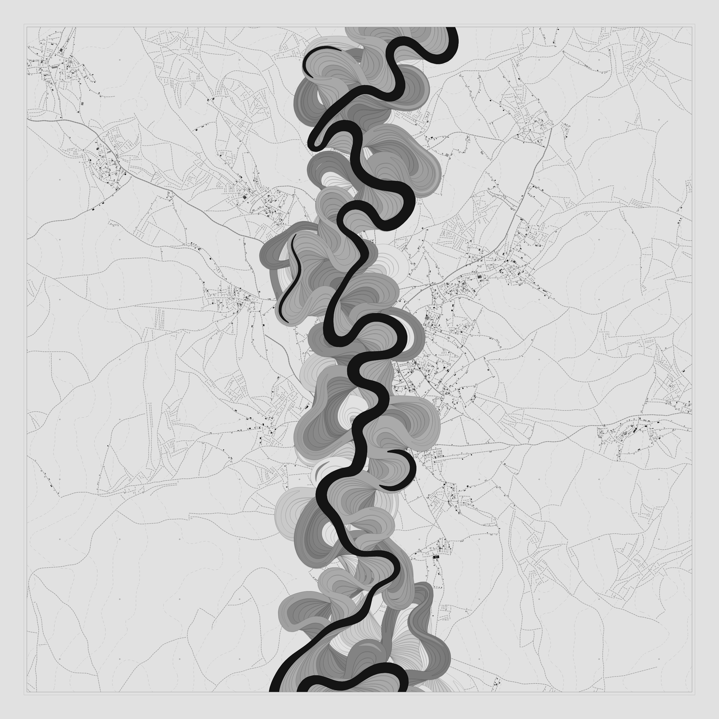 Ancient Courses is a generative experience that explores the aesthetics of meandering rivers and the settlements that form on their banks. The design is graphic and cartographic with bold color palettes rendered against map iconography and line sensibility. From the river banks, roads stretch across the landscape: sometimes a single access road, other times sprawling towns. The river meandering is simulated via a custom algorithm which closely models the real world process.