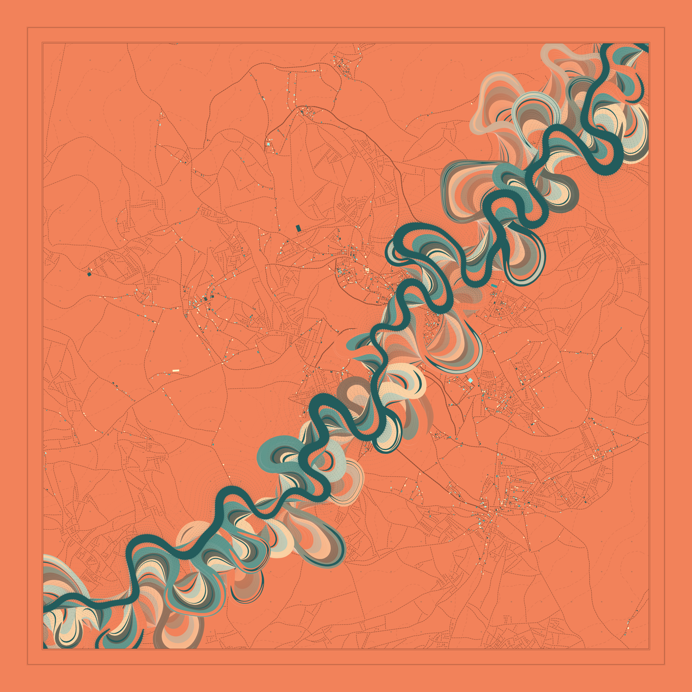 Ancient Courses is a generative experience that explores the aesthetics of meandering rivers and the settlements that form on their banks. The design is graphic and cartographic with bold color palettes rendered against map iconography and line sensibility. From the river banks, roads stretch across the landscape: sometimes a single access road, other times sprawling towns. The river meandering is simulated via a custom algorithm which closely models the real world process.