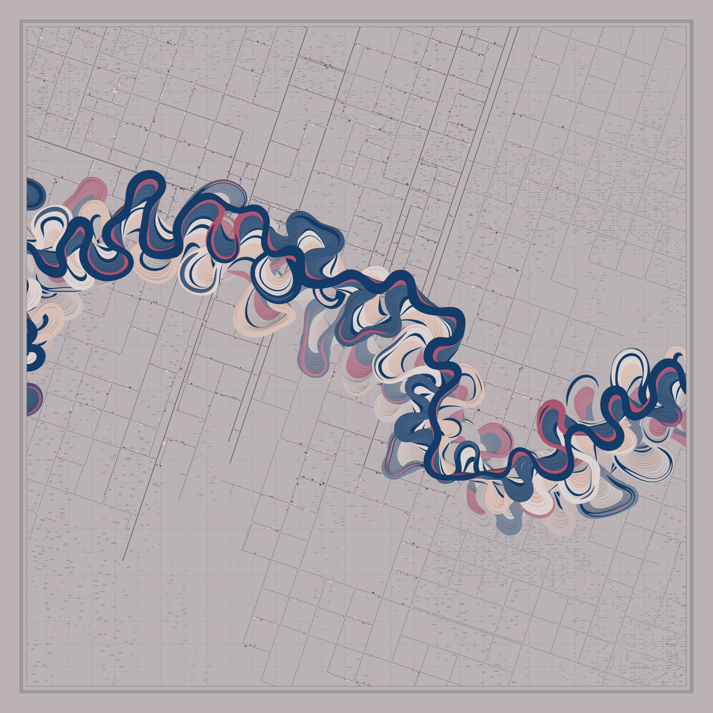 Ancient Courses is a generative experience that explores the aesthetics of meandering rivers and the settlements that form on their banks. The design is graphic and cartographic with bold color palettes rendered against map iconography and line sensibility. From the river banks, roads stretch across the landscape: sometimes a single access road, other times sprawling towns. The river meandering is simulated via a custom algorithm which closely models the real world process.