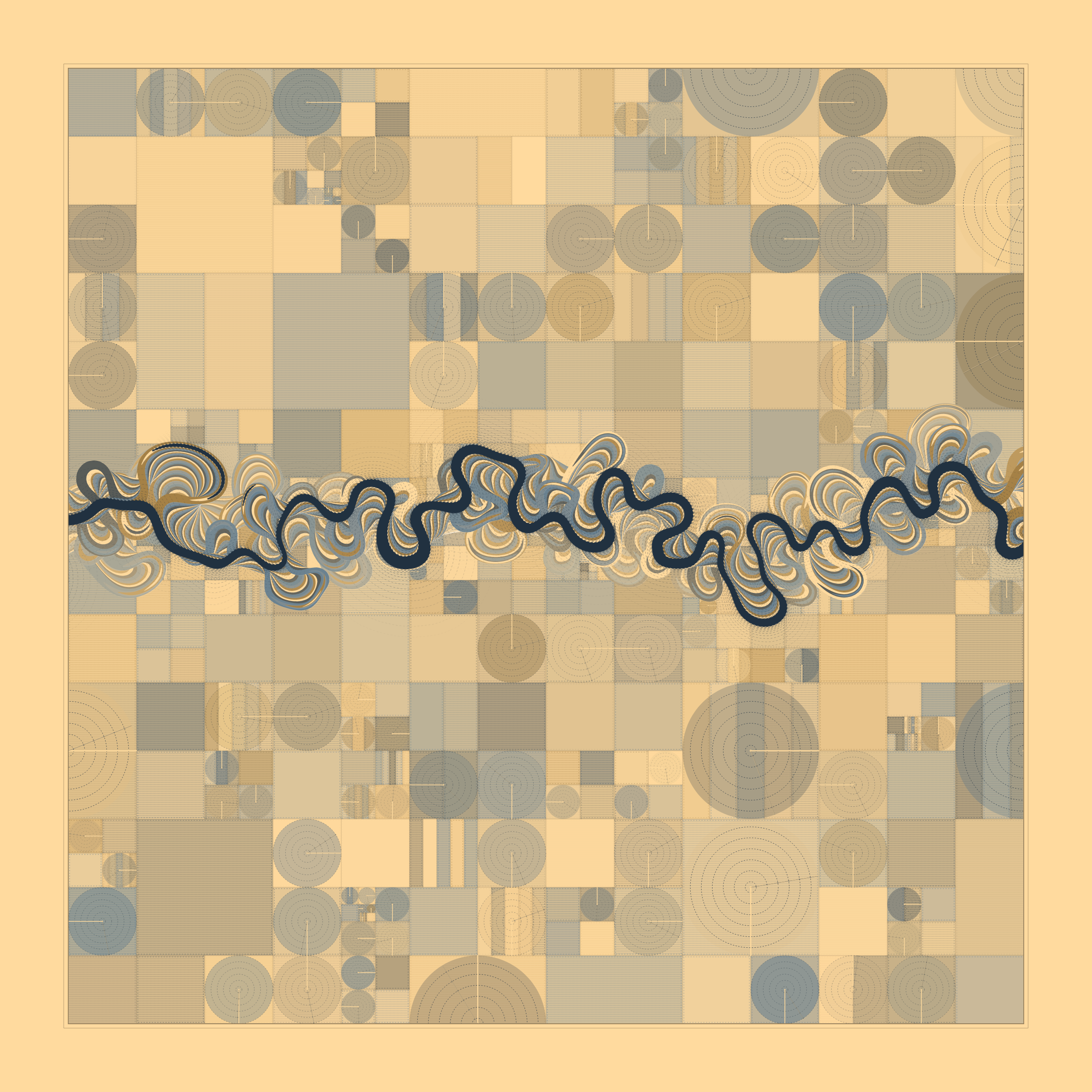 Ancient Courses is a generative experience that explores the aesthetics of meandering rivers and the settlements that form on their banks. The design is graphic and cartographic with bold color palettes rendered against map iconography and line sensibility. From the river banks, roads stretch across the landscape: sometimes a single access road, other times sprawling towns. The river meandering is simulated via a custom algorithm which closely models the real world process.