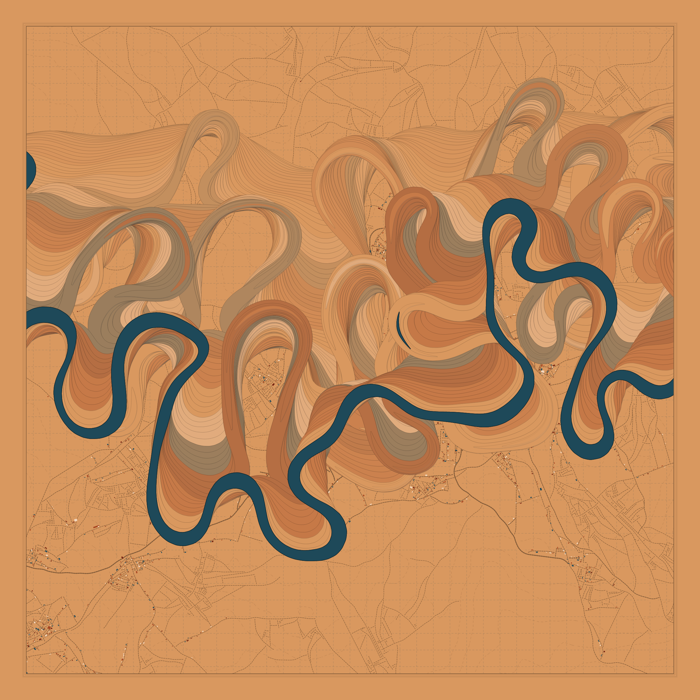 Ancient Courses is a generative experience that explores the aesthetics of meandering rivers and the settlements that form on their banks. The design is graphic and cartographic with bold color palettes rendered against map iconography and line sensibility. From the river banks, roads stretch across the landscape: sometimes a single access road, other times sprawling towns. The river meandering is simulated via a custom algorithm which closely models the real world process.