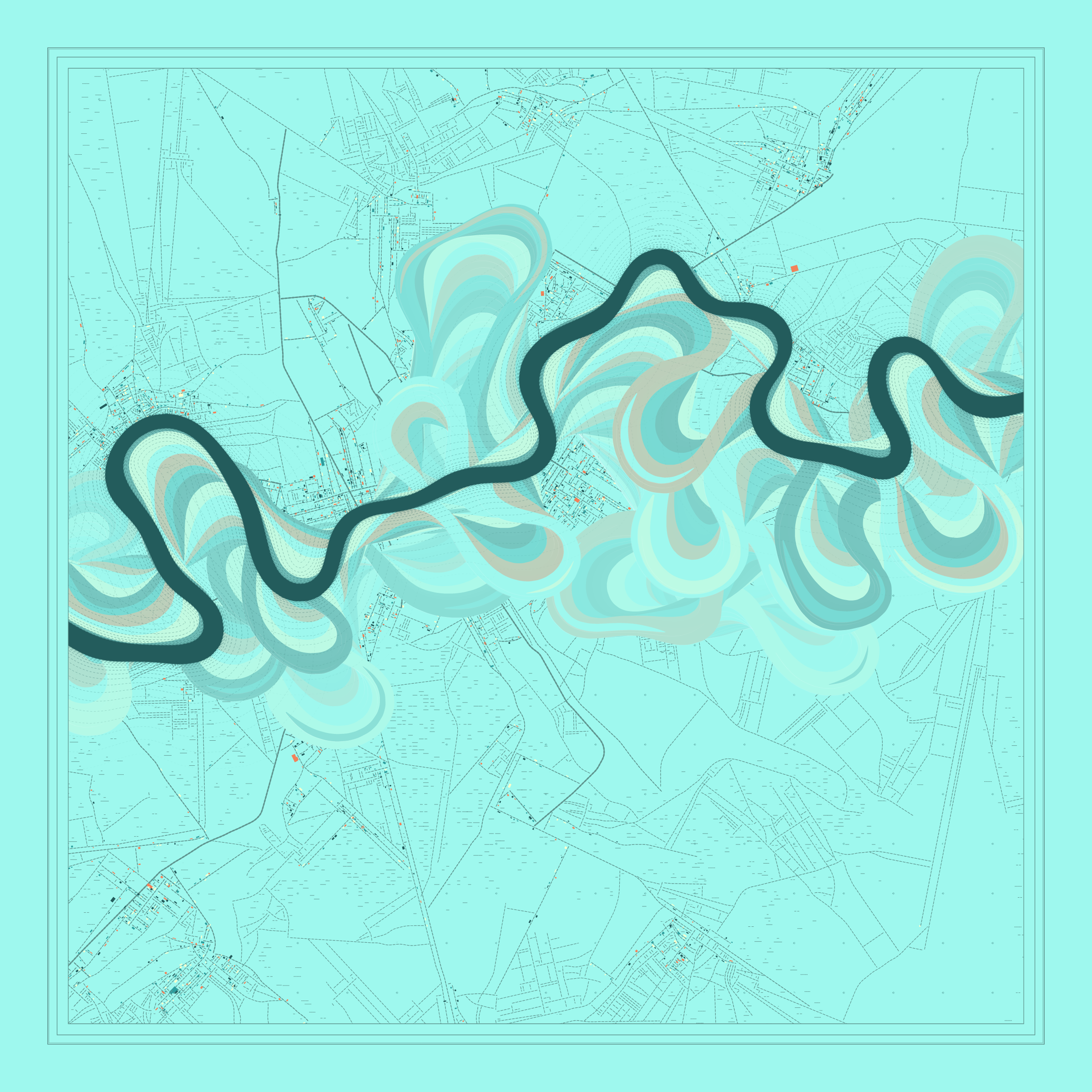 Ancient Courses is a generative experience that explores the aesthetics of meandering rivers and the settlements that form on their banks. The design is graphic and cartographic with bold color palettes rendered against map iconography and line sensibility. From the river banks, roads stretch across the landscape: sometimes a single access road, other times sprawling towns. The river meandering is simulated via a custom algorithm which closely models the real world process.