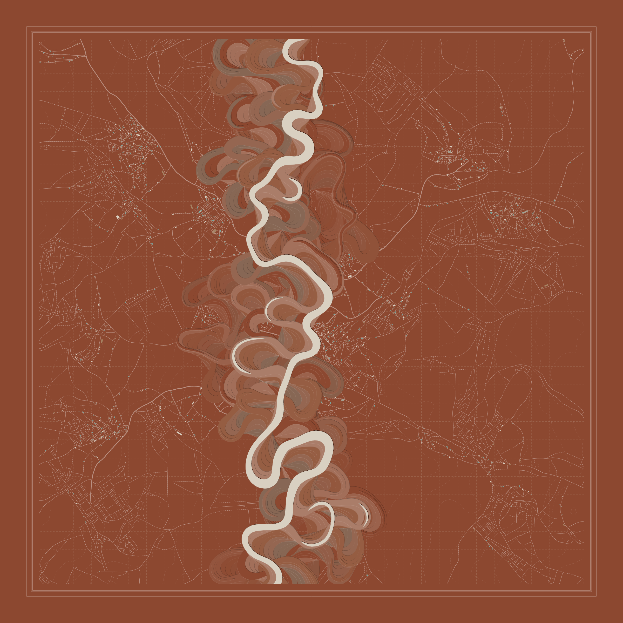 Ancient Courses is a generative experience that explores the aesthetics of meandering rivers and the settlements that form on their banks. The design is graphic and cartographic with bold color palettes rendered against map iconography and line sensibility. From the river banks, roads stretch across the landscape: sometimes a single access road, other times sprawling towns. The river meandering is simulated via a custom algorithm which closely models the real world process.