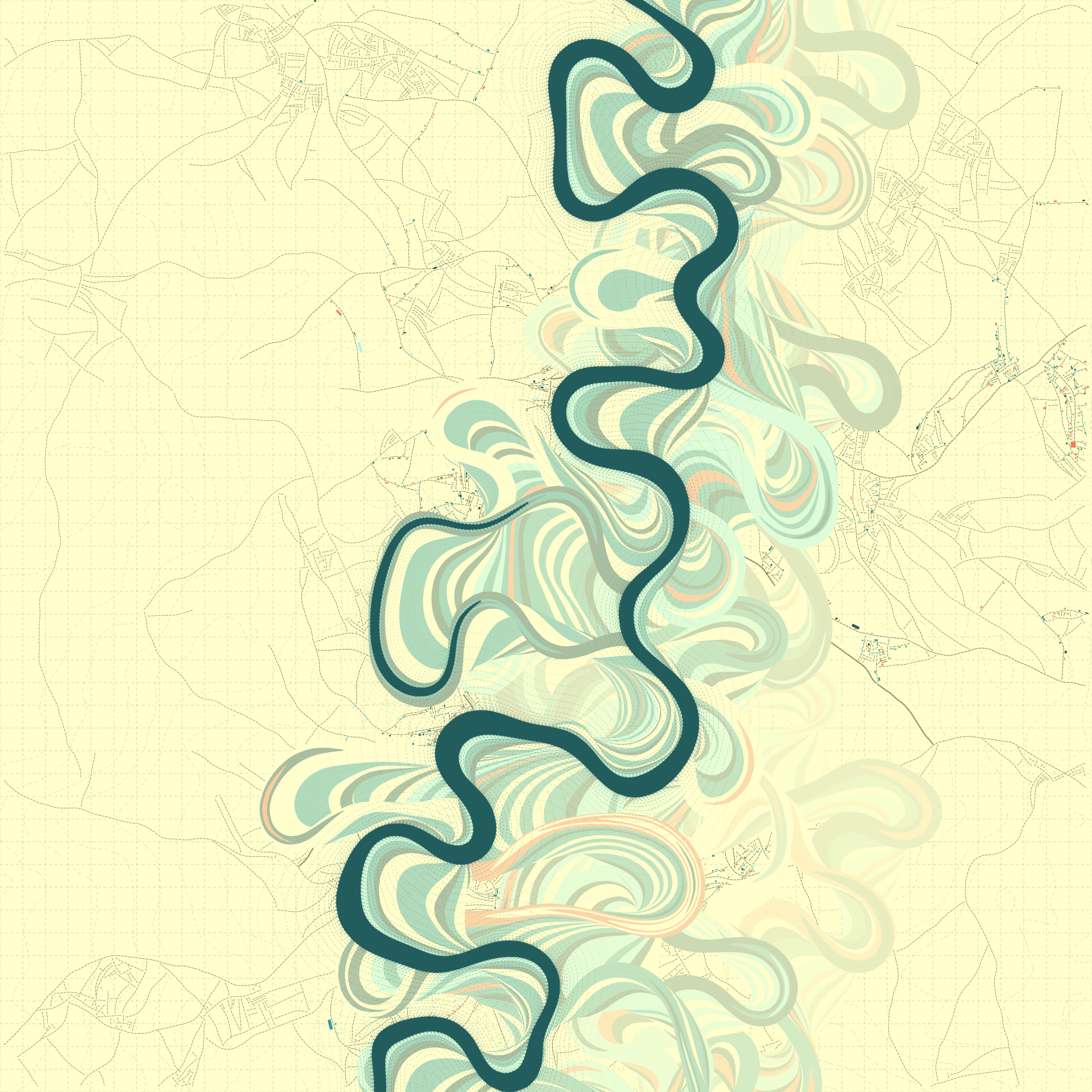 Ancient Courses is a generative experience that explores the aesthetics of meandering rivers and the settlements that form on their banks. The design is graphic and cartographic with bold color palettes rendered against map iconography and line sensibility. From the river banks, roads stretch across the landscape: sometimes a single access road, other times sprawling towns. The river meandering is simulated via a custom algorithm which closely models the real world process.