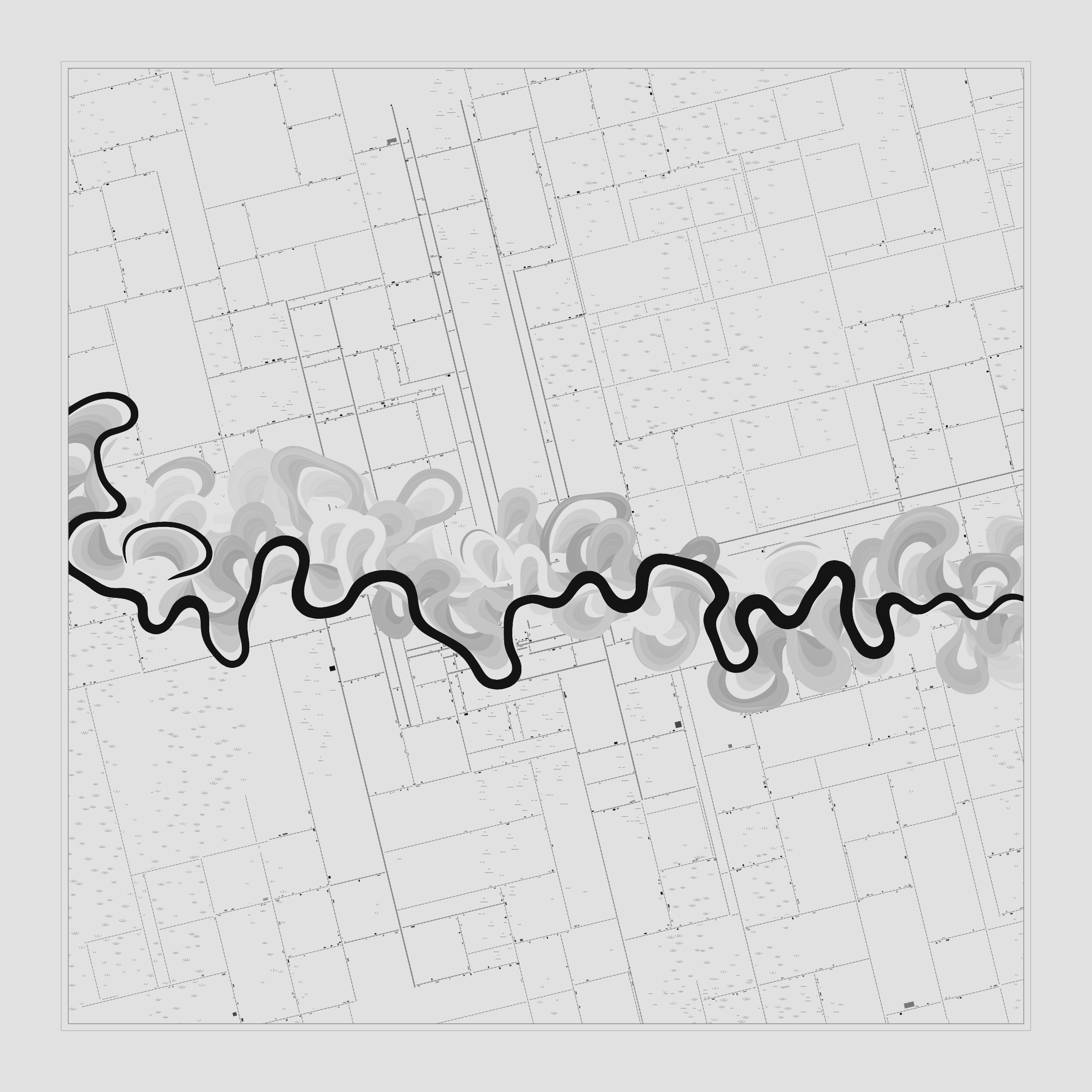 Ancient Courses is a generative experience that explores the aesthetics of meandering rivers and the settlements that form on their banks. The design is graphic and cartographic with bold color palettes rendered against map iconography and line sensibility. From the river banks, roads stretch across the landscape: sometimes a single access road, other times sprawling towns. The river meandering is simulated via a custom algorithm which closely models the real world process.