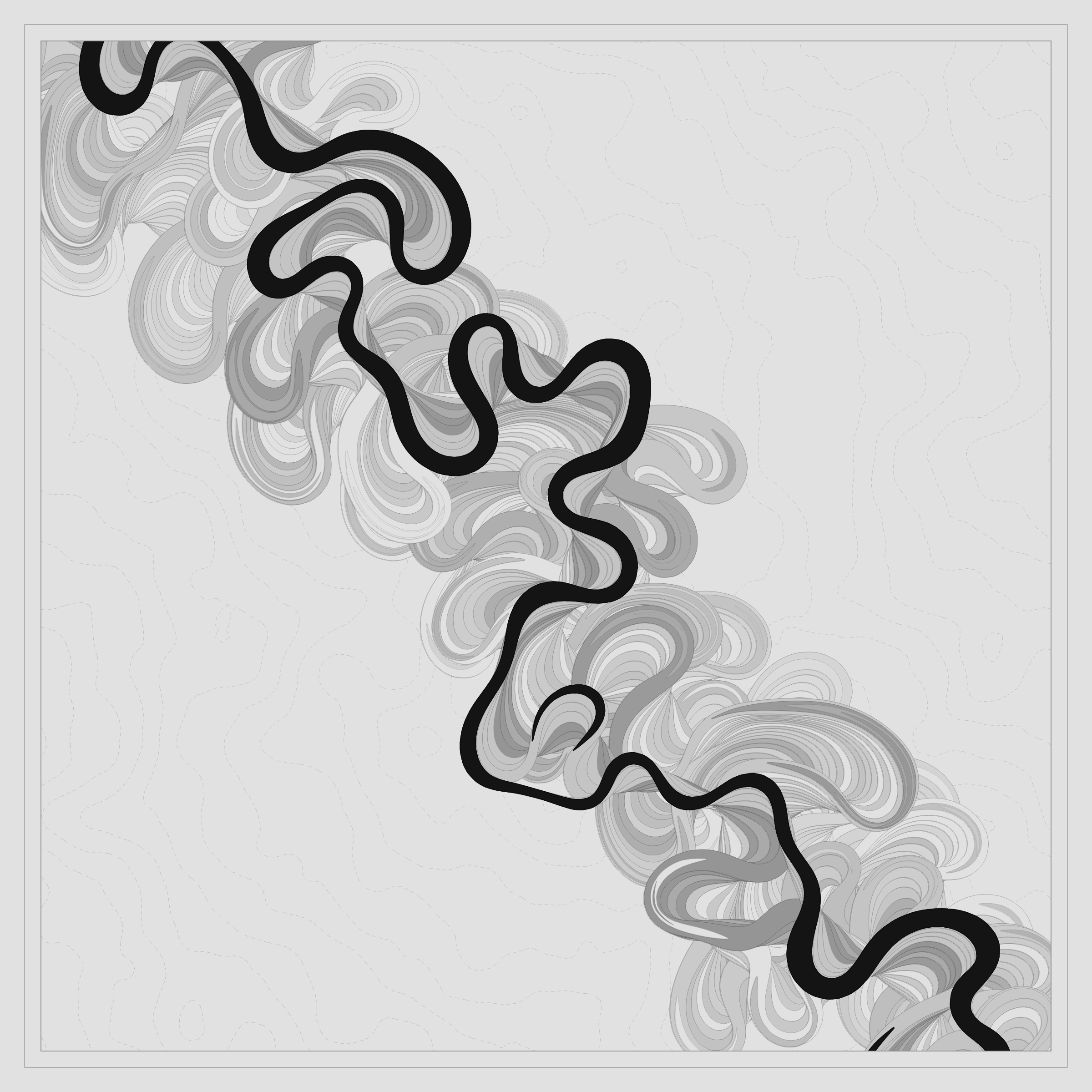 Ancient Courses is a generative experience that explores the aesthetics of meandering rivers and the settlements that form on their banks. The design is graphic and cartographic with bold color palettes rendered against map iconography and line sensibility. From the river banks, roads stretch across the landscape: sometimes a single access road, other times sprawling towns. The river meandering is simulated via a custom algorithm which closely models the real world process.